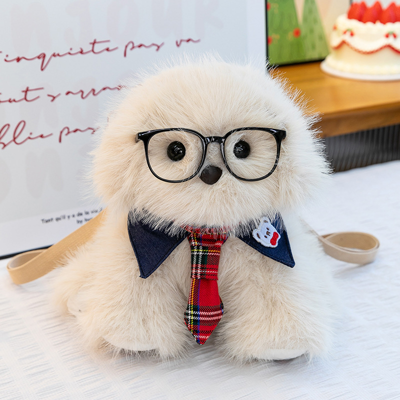 新款仿真个性玩偶背包甜美少女高颜值休闲丑萌眼镜领结小狗双肩包