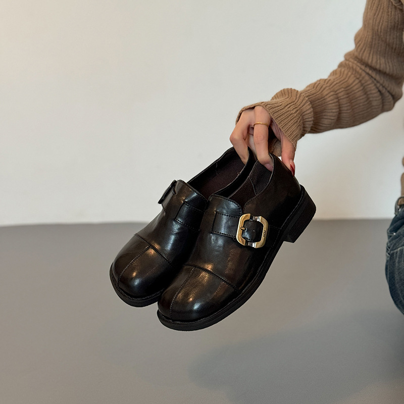 大码皮带扣显瘦平底真皮乐福鞋女黑色百搭软底单鞋软皮圆头小皮鞋