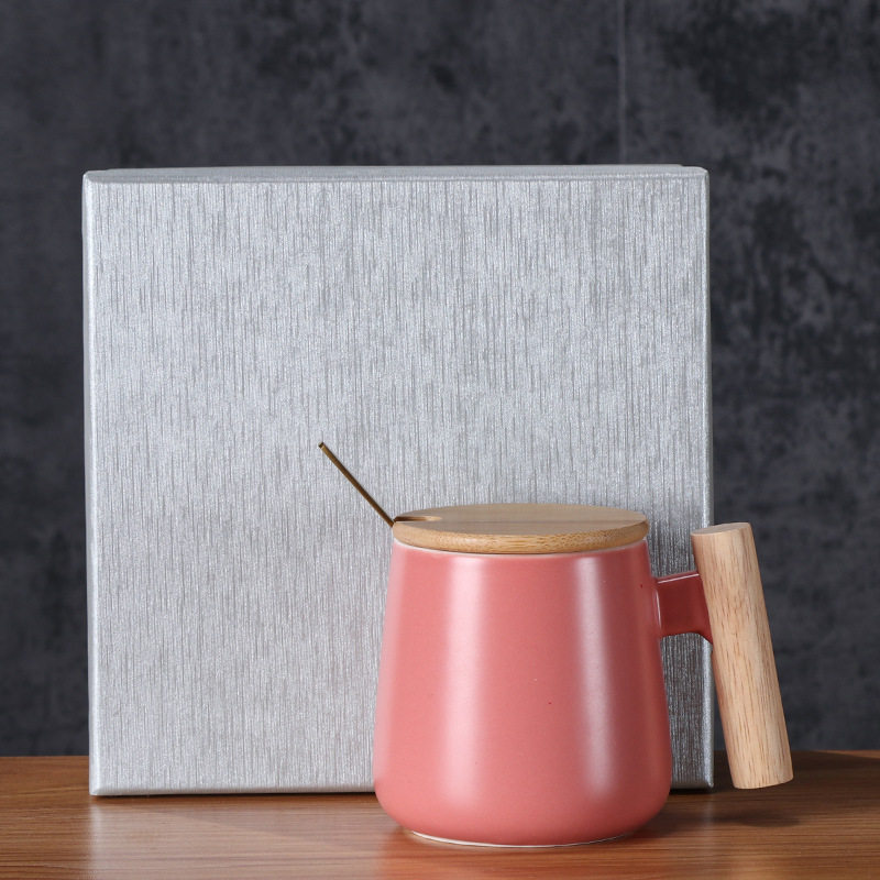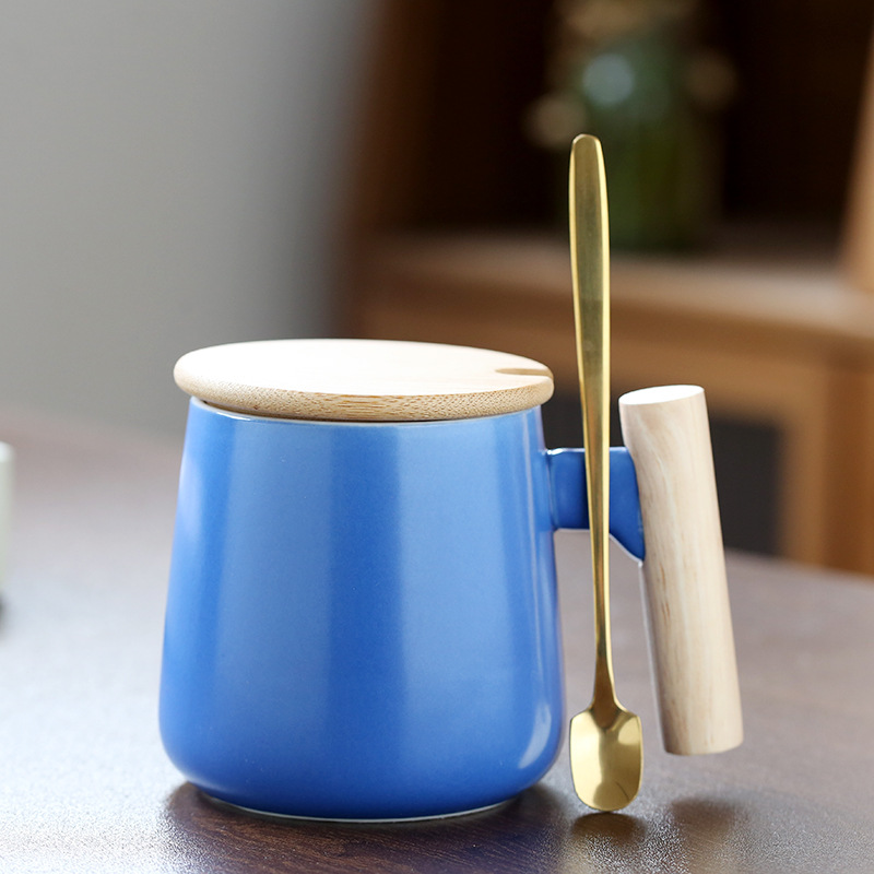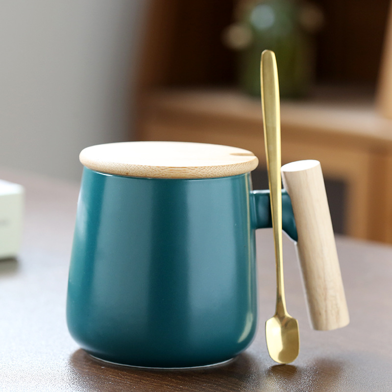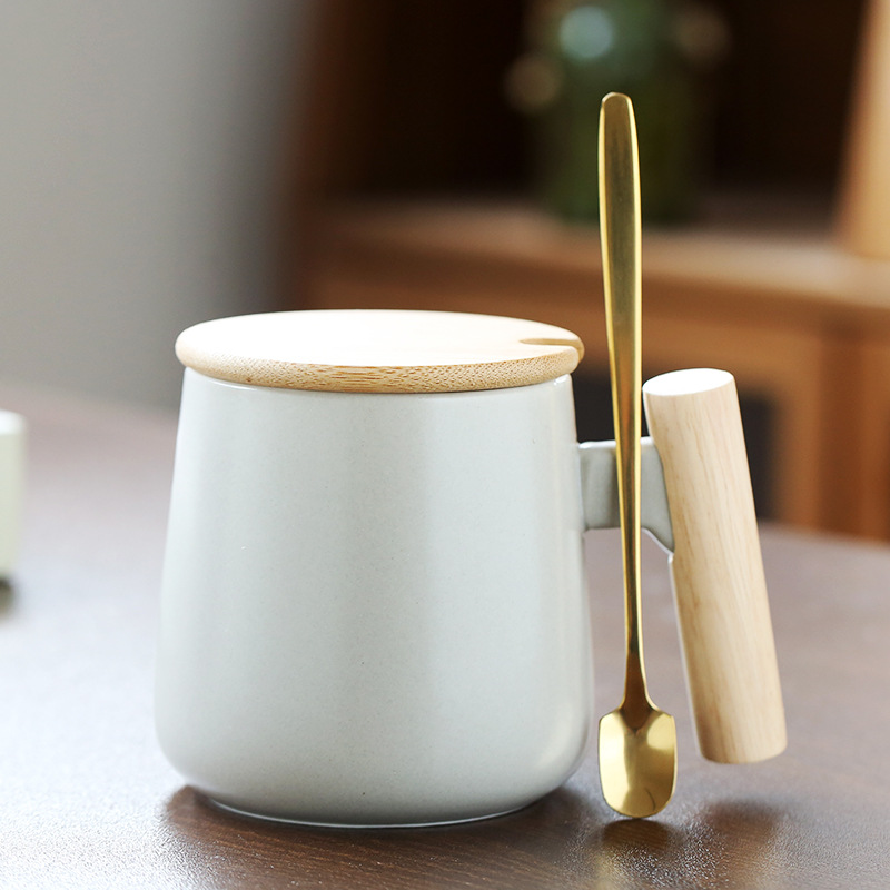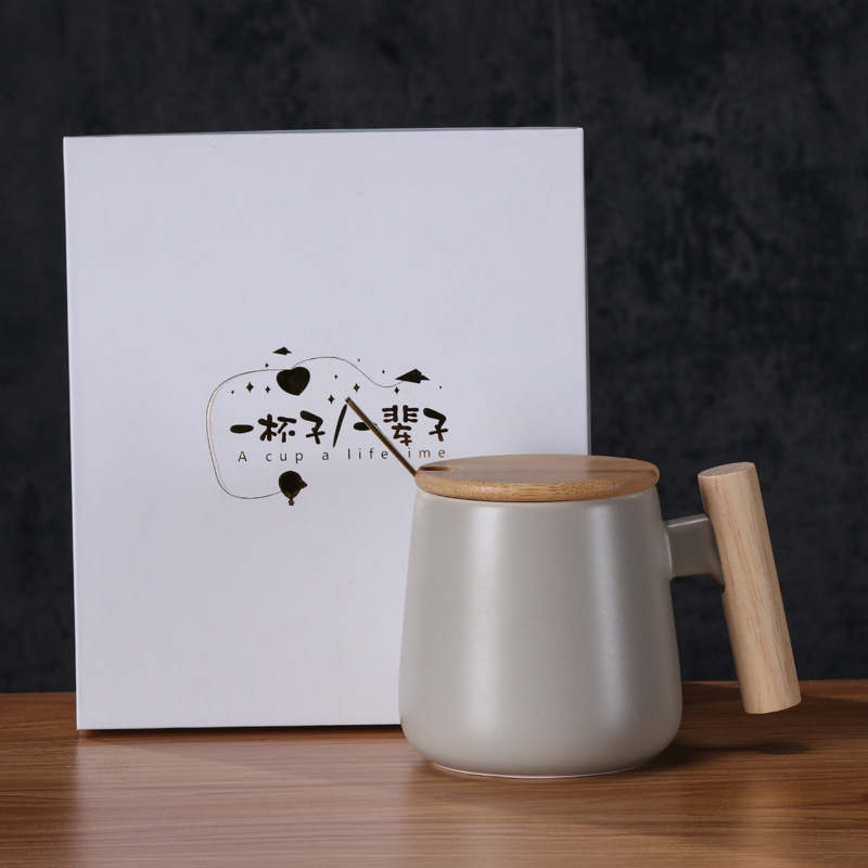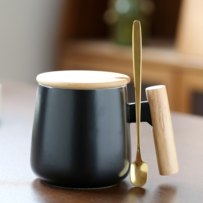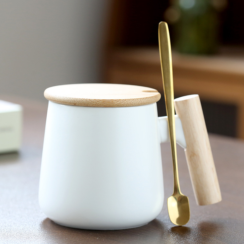 北欧简约木柄陶瓷马克杯带盖勺办公室水杯咖啡杯活动礼品印制logo