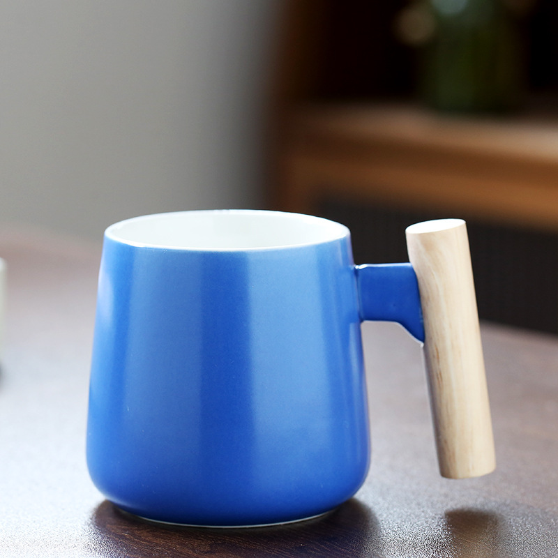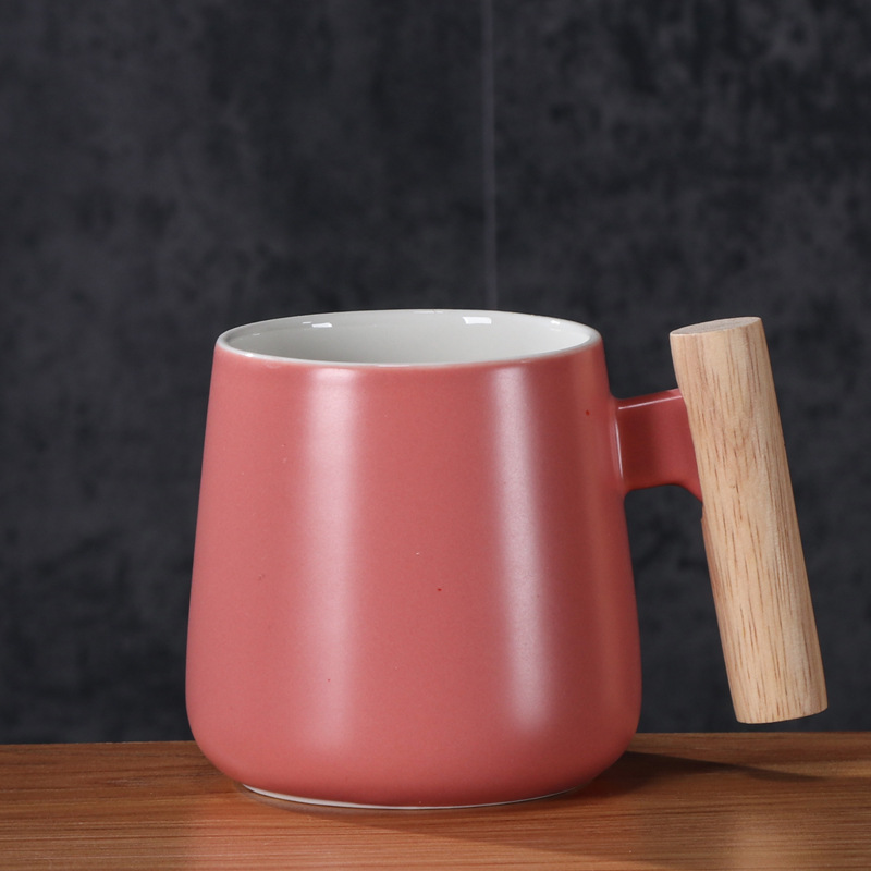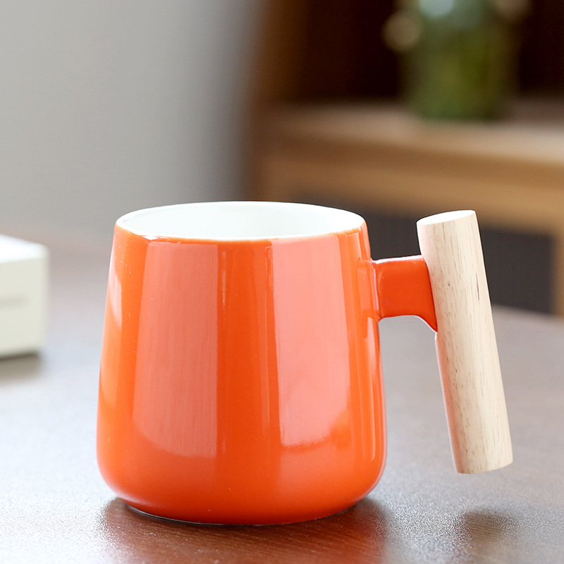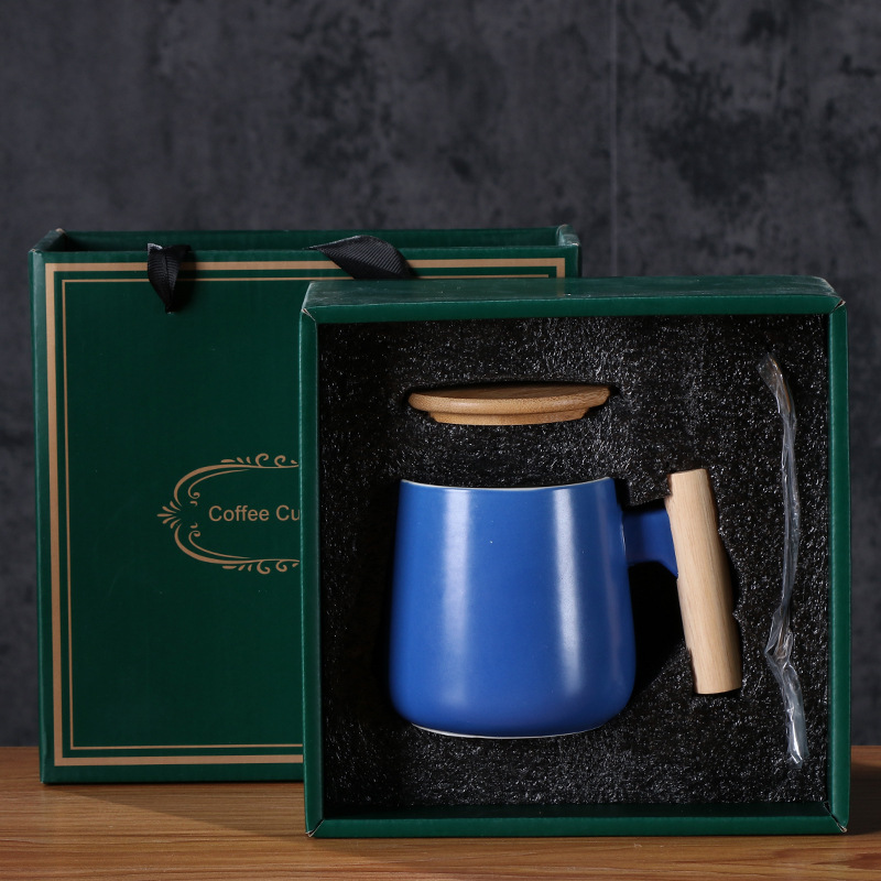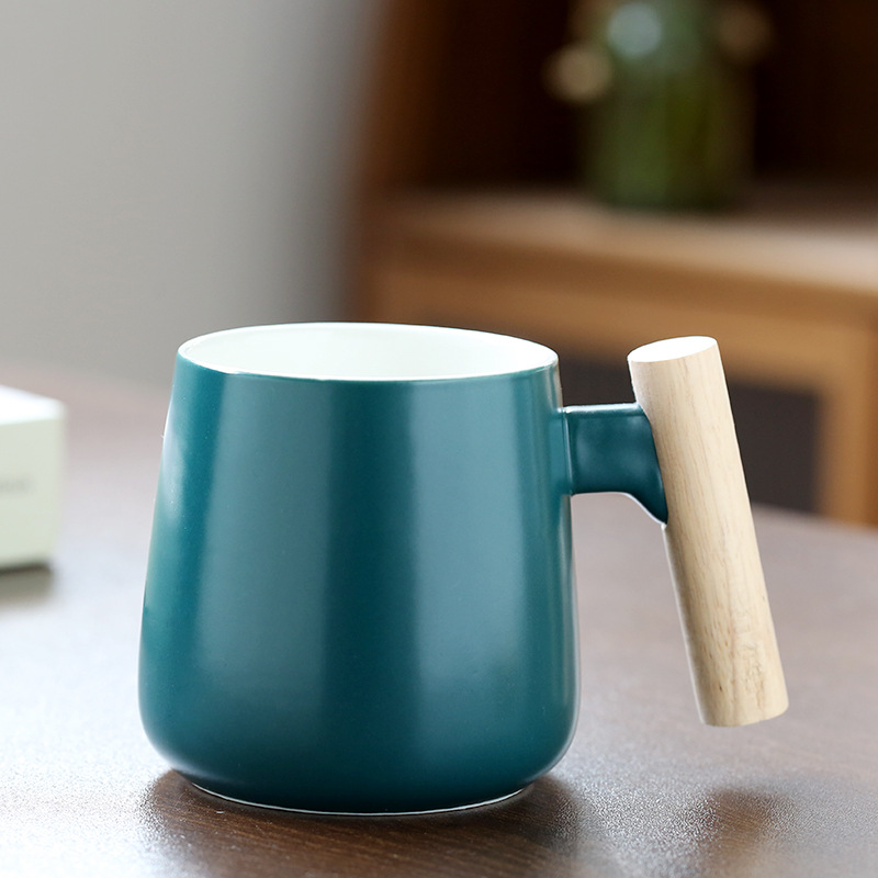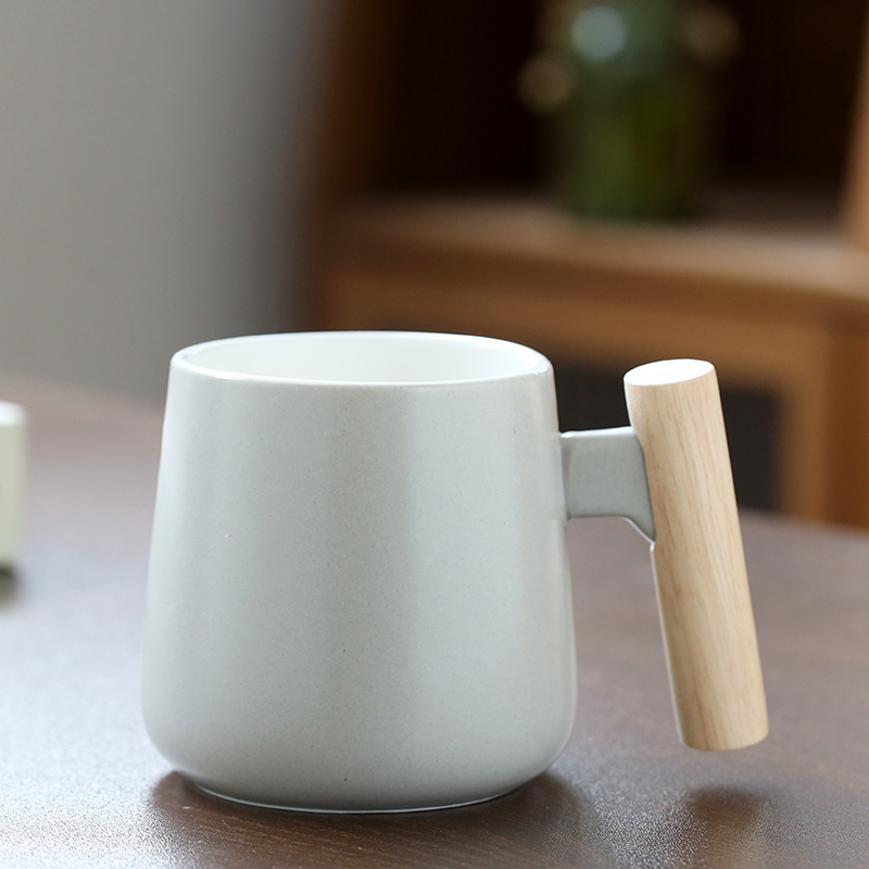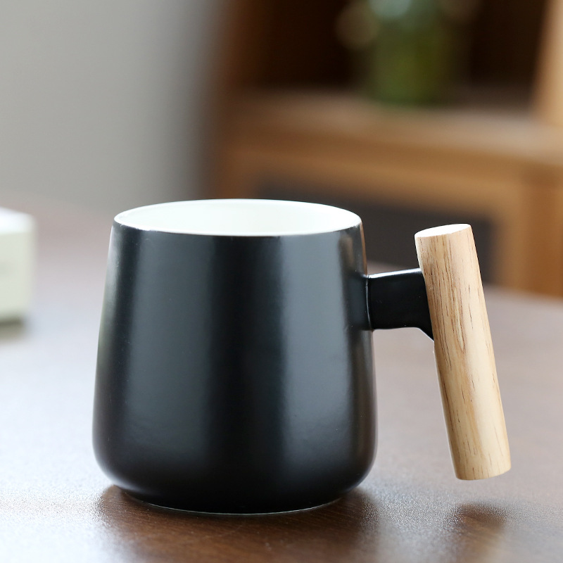 北欧简约木柄陶瓷马克杯带盖勺办公室水杯咖啡杯活动礼品印制logo
