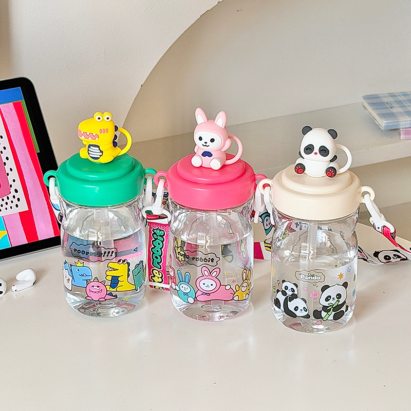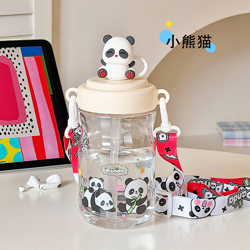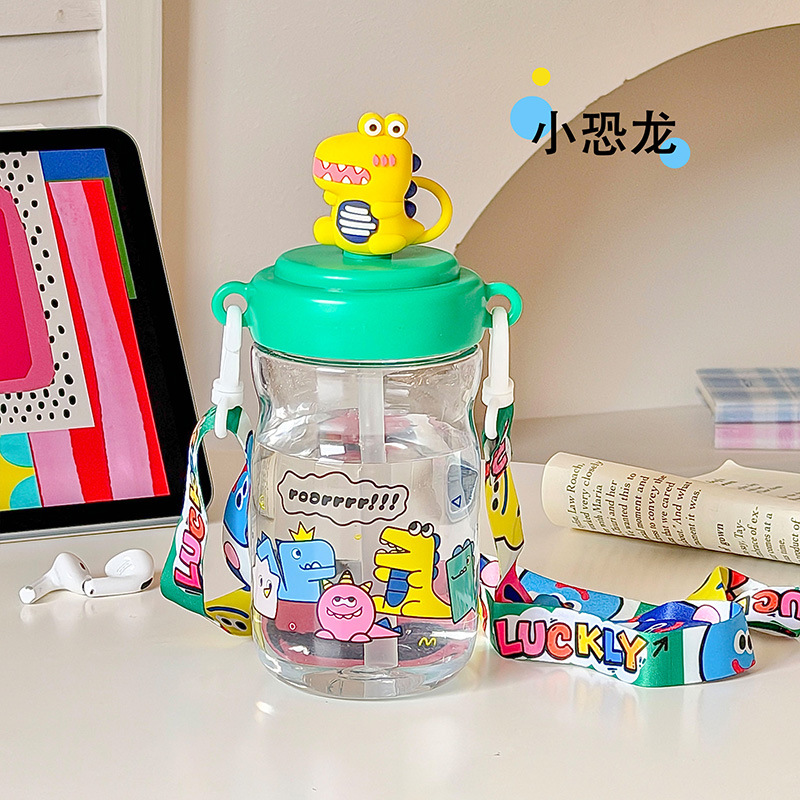 高颜值大容量pc吸管杯可爱卡通学生男女上学杯子背带塑料杯子水壶