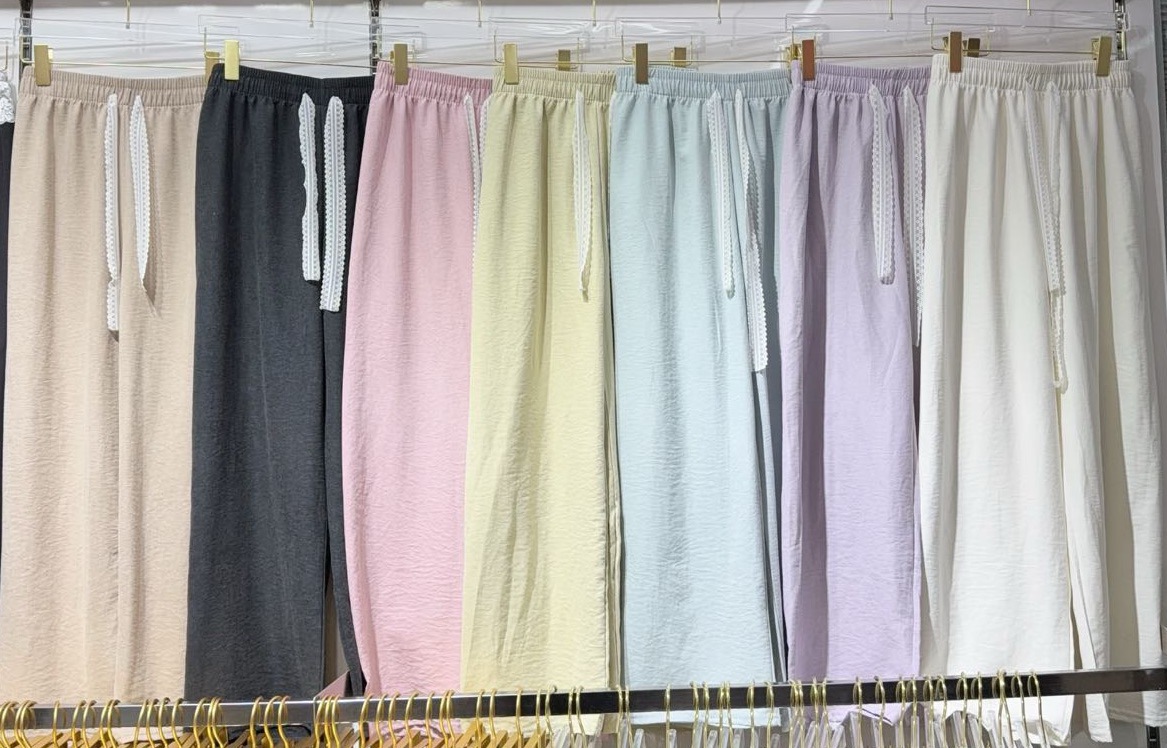 时尚蕾丝飘带奶芙女裤冰丝阔腿裤夏季薄款垂感休闲宽松直筒裤子女