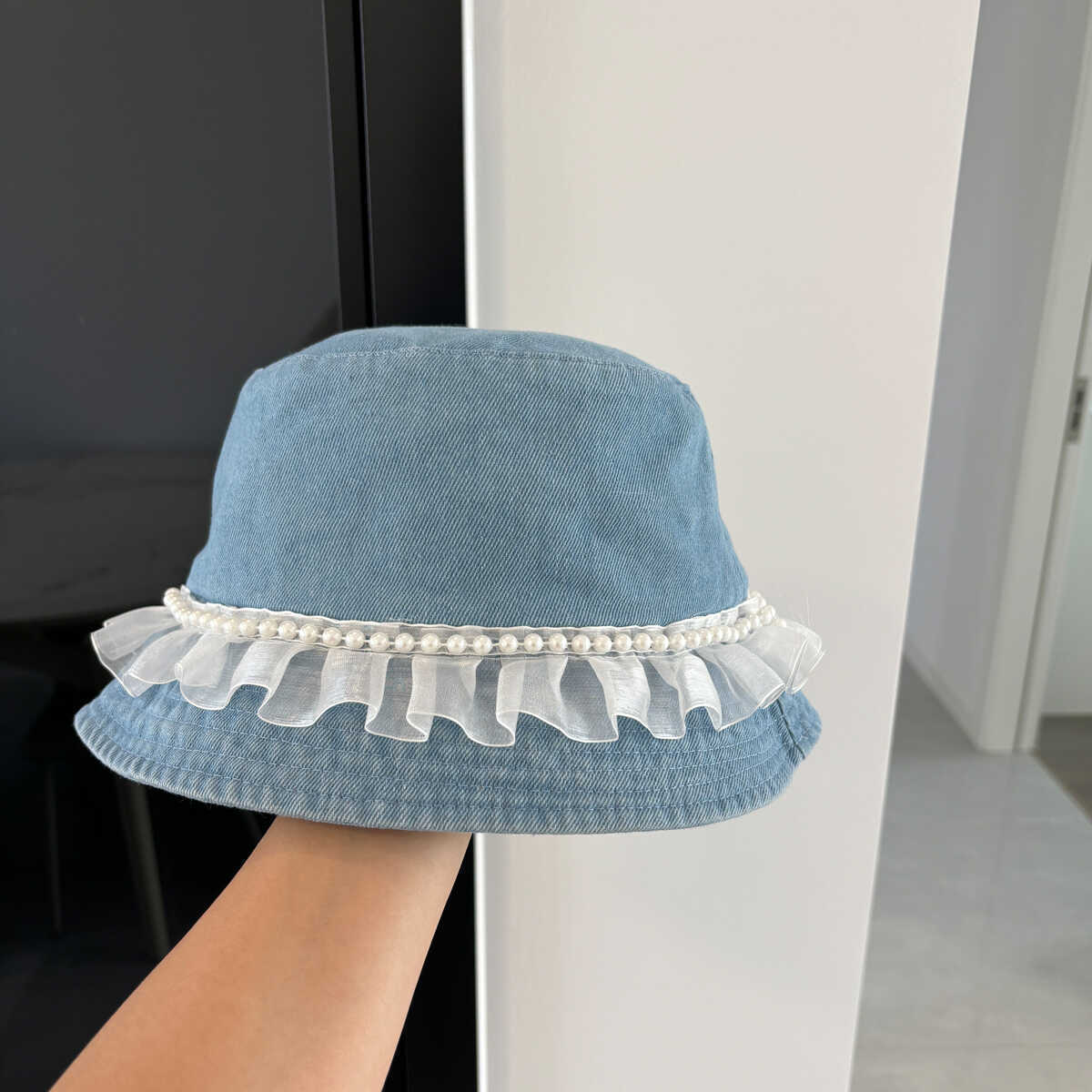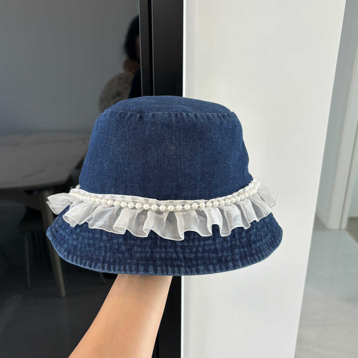 超仙珍珠花边带水桶帽子女秋季新款牛仔布帽简约百搭盆帽潮渔夫帽