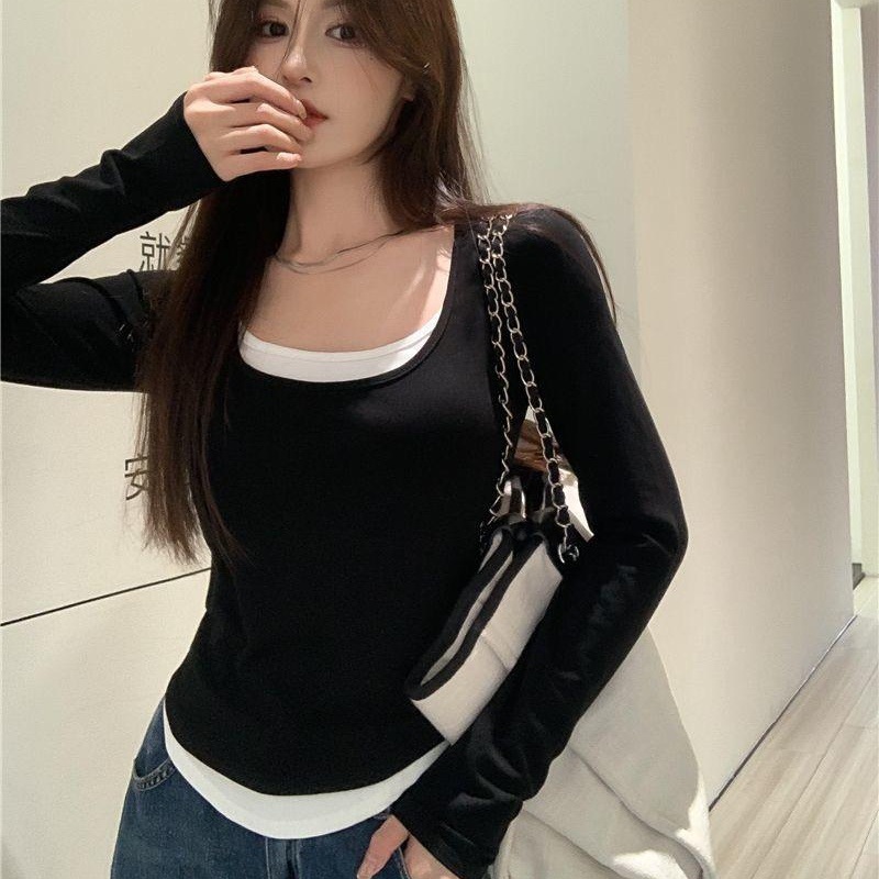 女士纯欲U领T恤修身显瘦设计感小众内搭打底外穿女假两件长袖上衣