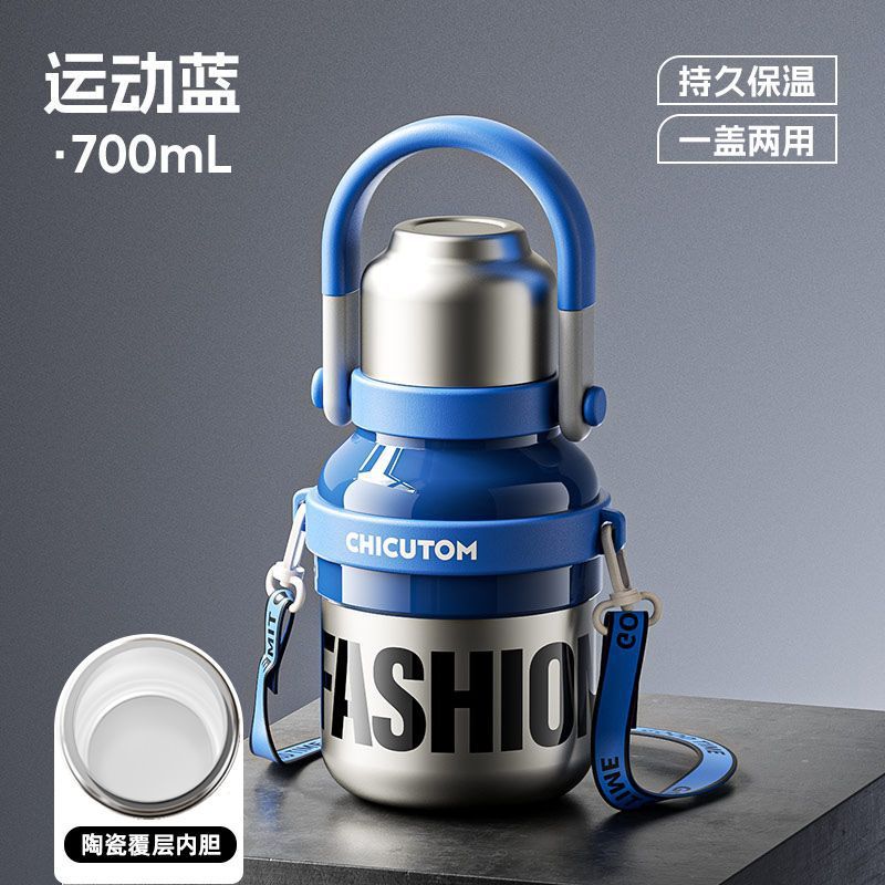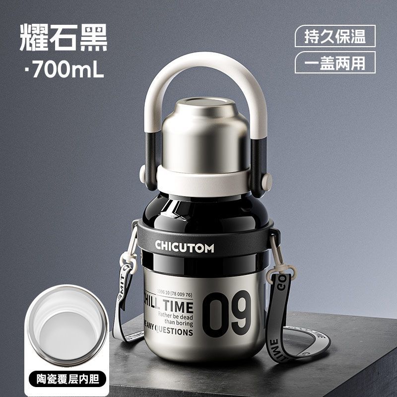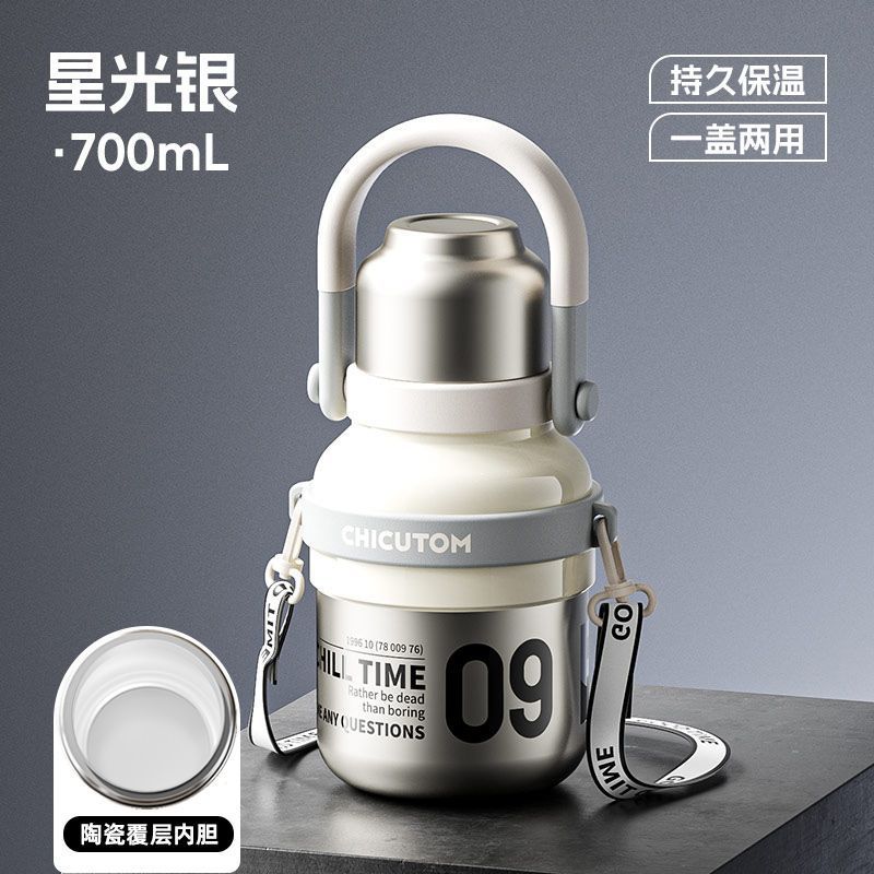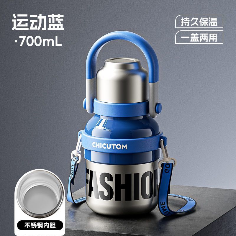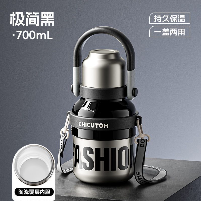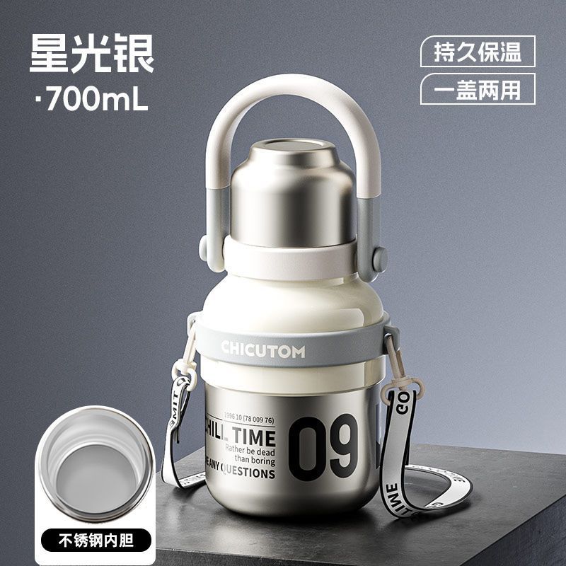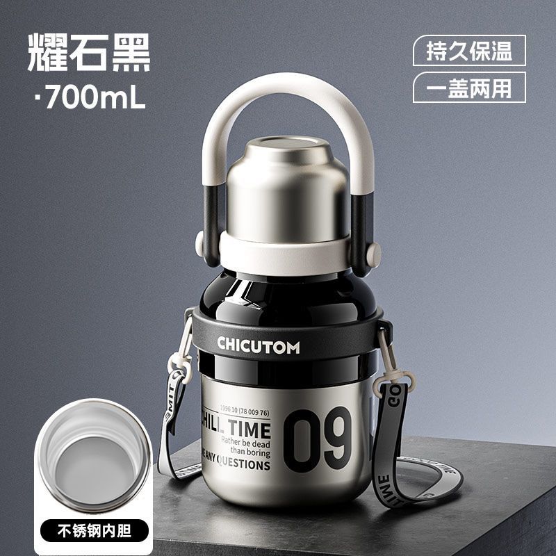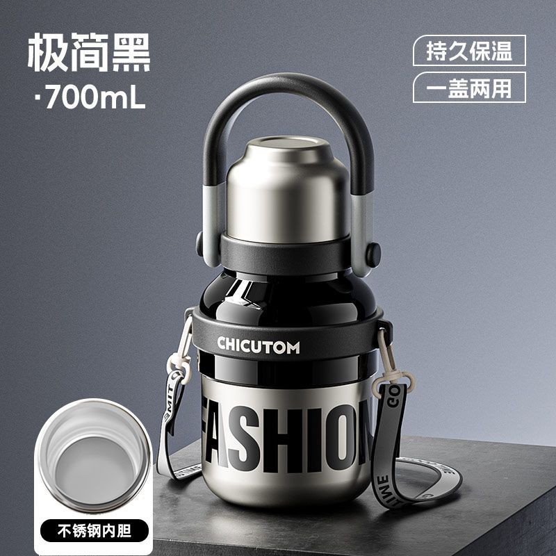 高颜值新款不锈钢手拎机甲风保温杯大容量便携户外背带保温水壶