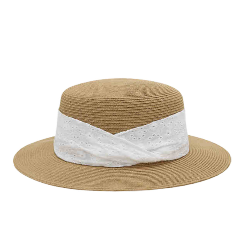 褶皱蕾丝织带+卡其平顶草帽