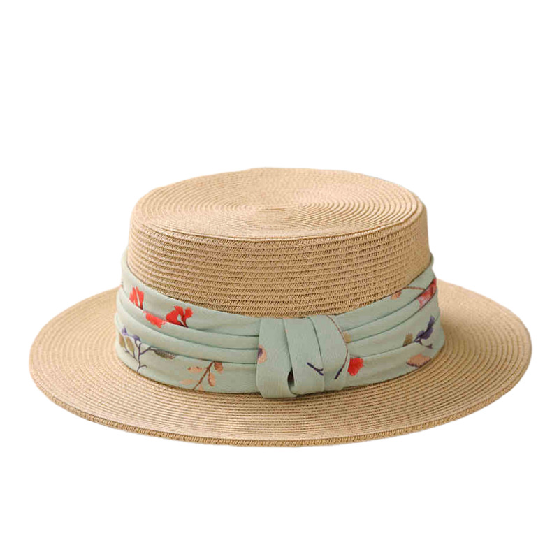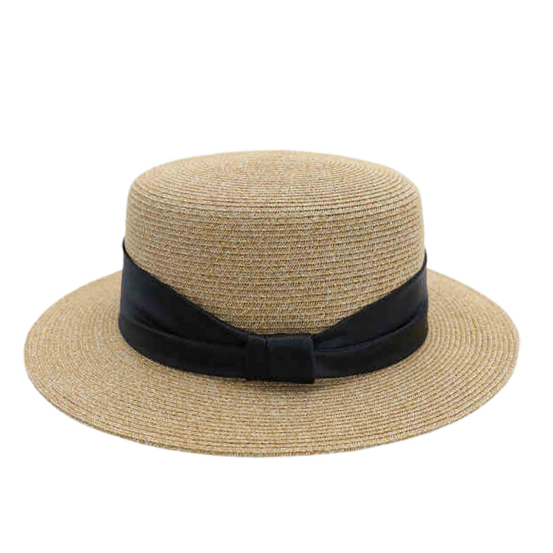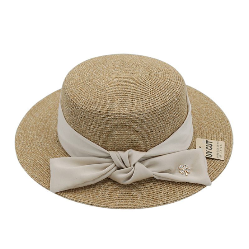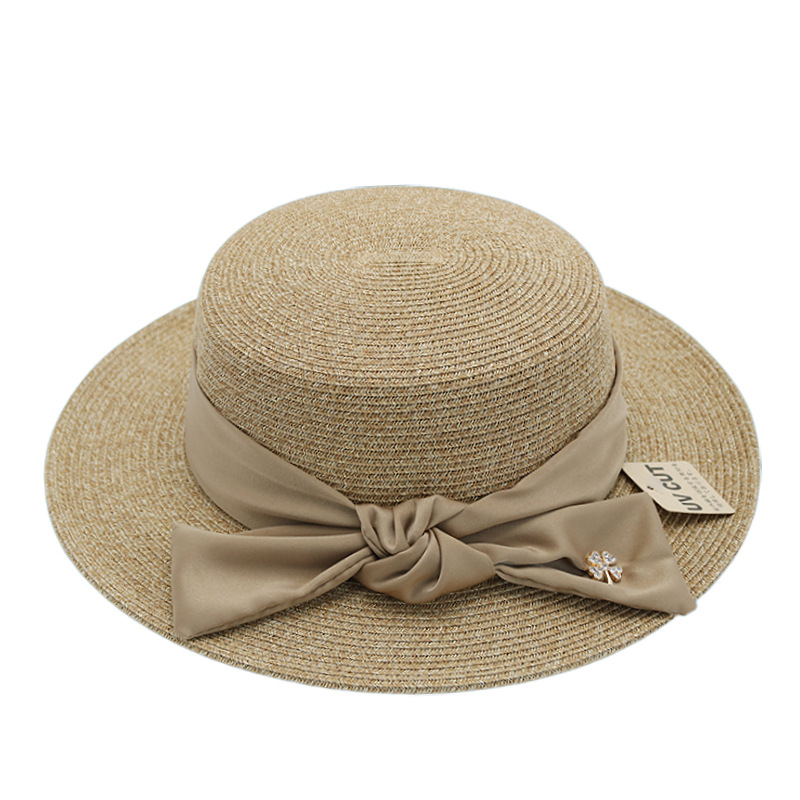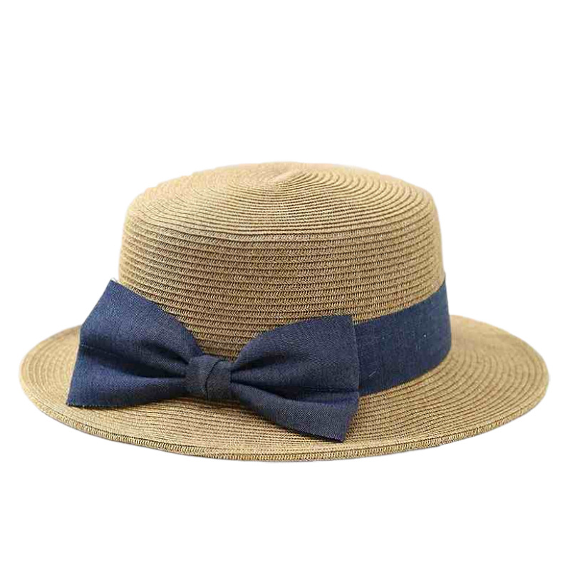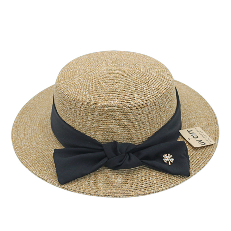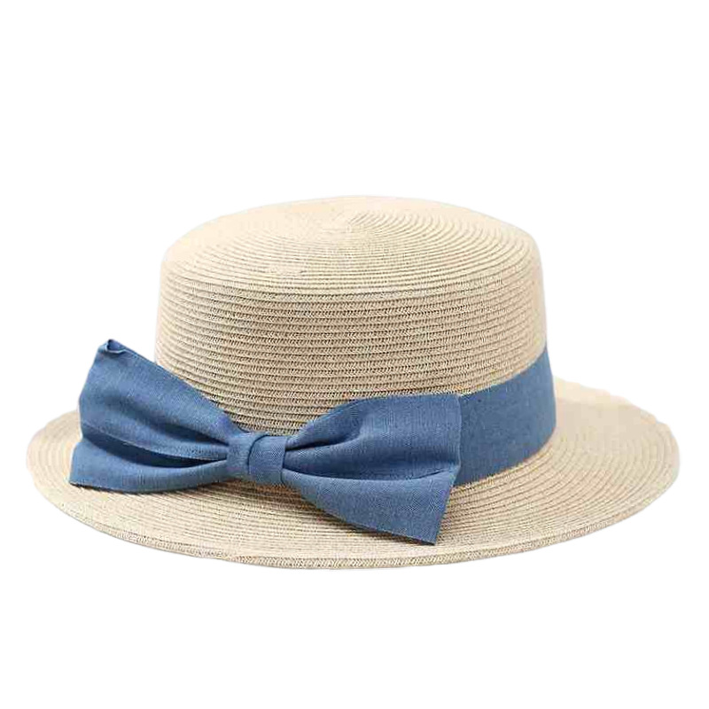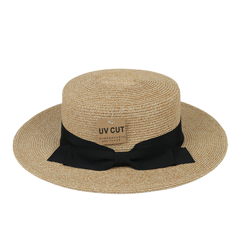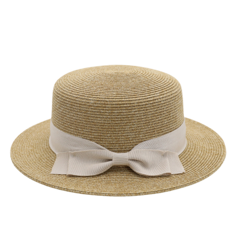 法式优雅平沿草帽女日系蝴蝶结防晒平顶礼帽夏天出游度假沙滩帽子