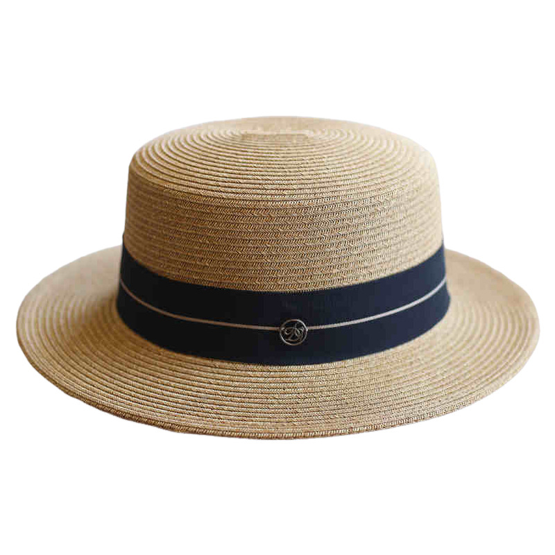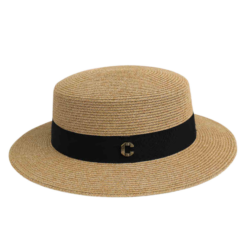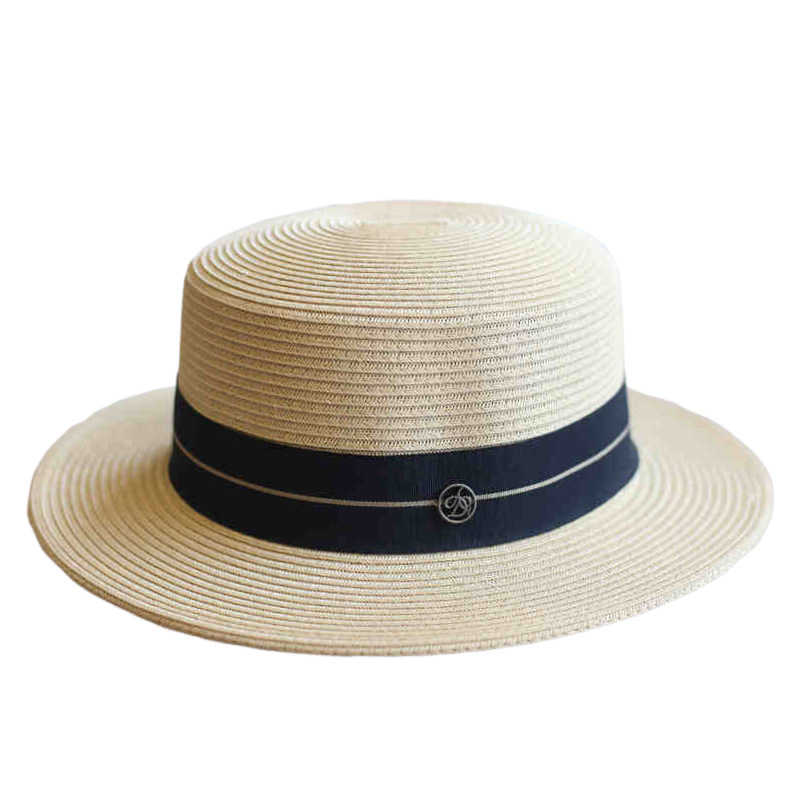 黑色线条织带+ 米色平顶草帽