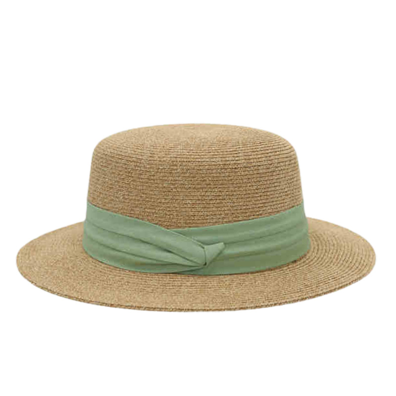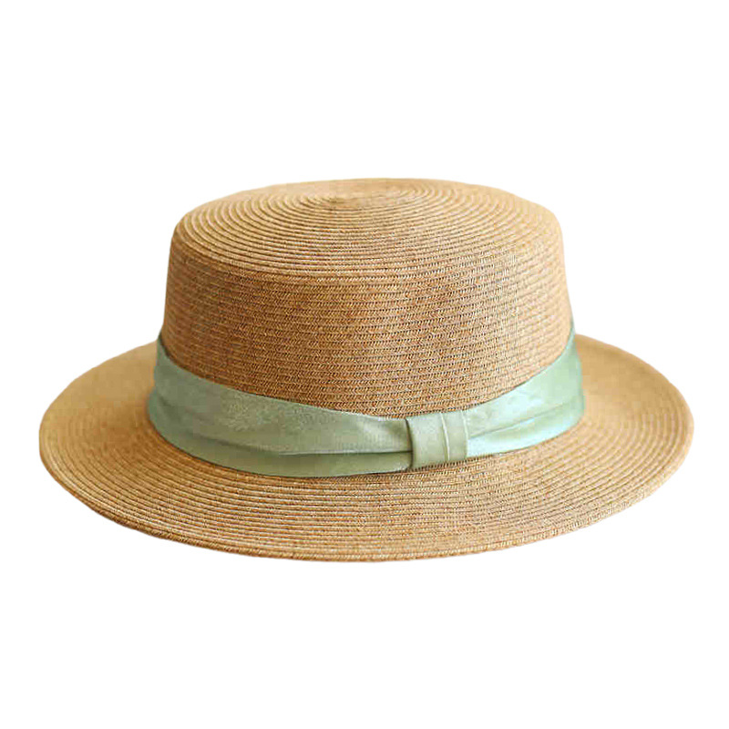 绿色三折织带+卡其平顶草帽