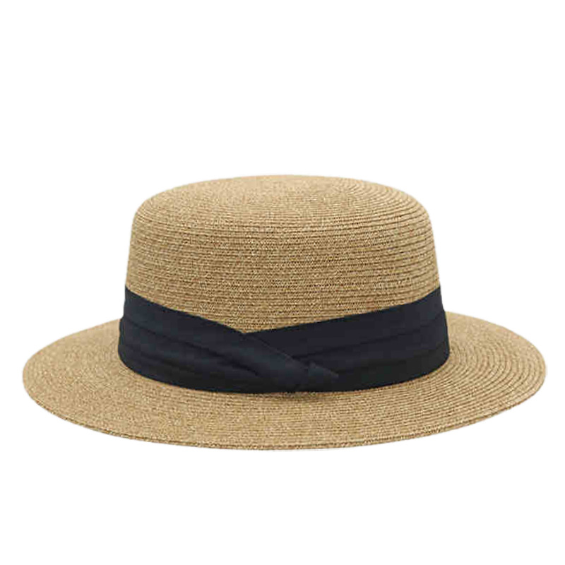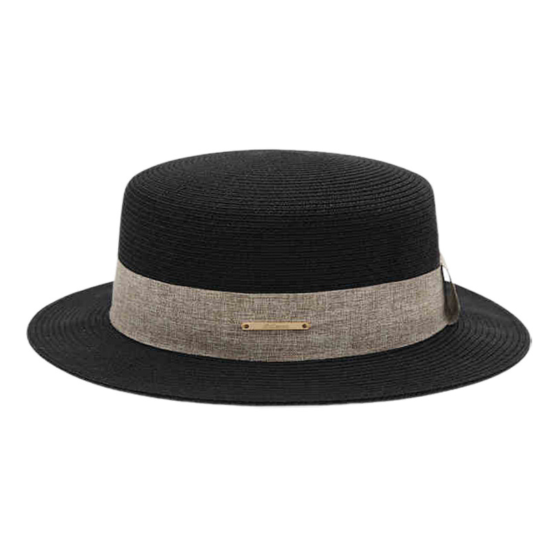 黑色三折织带+卡其平顶草帽