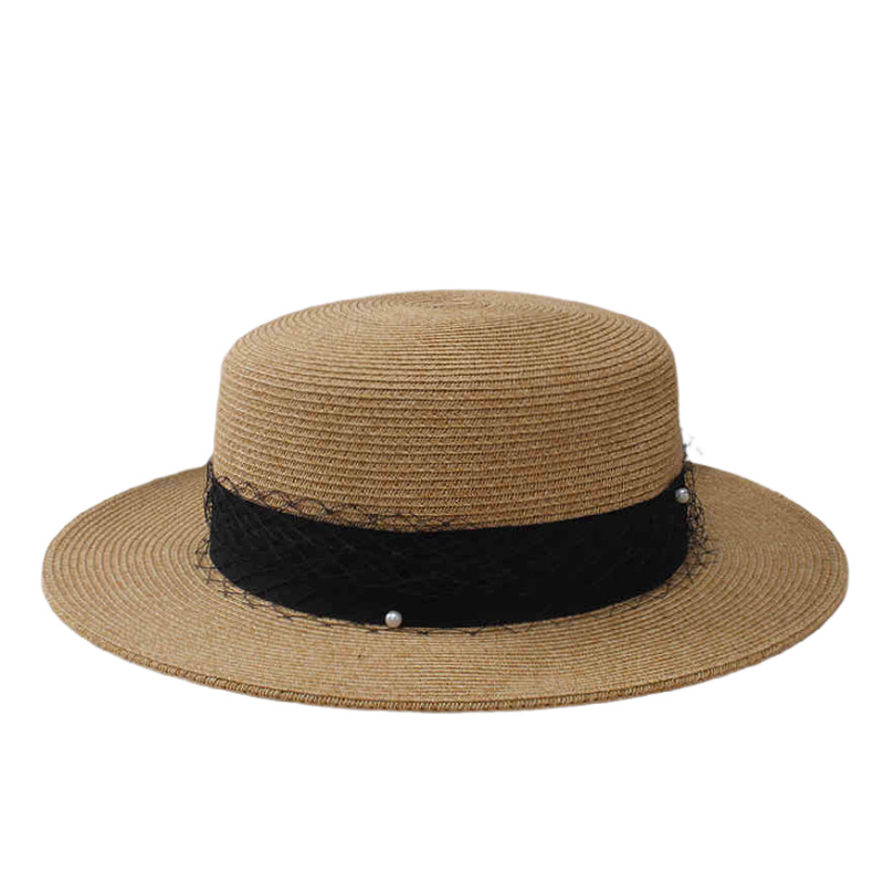 黑色网纱织带+ 卡其平顶草帽