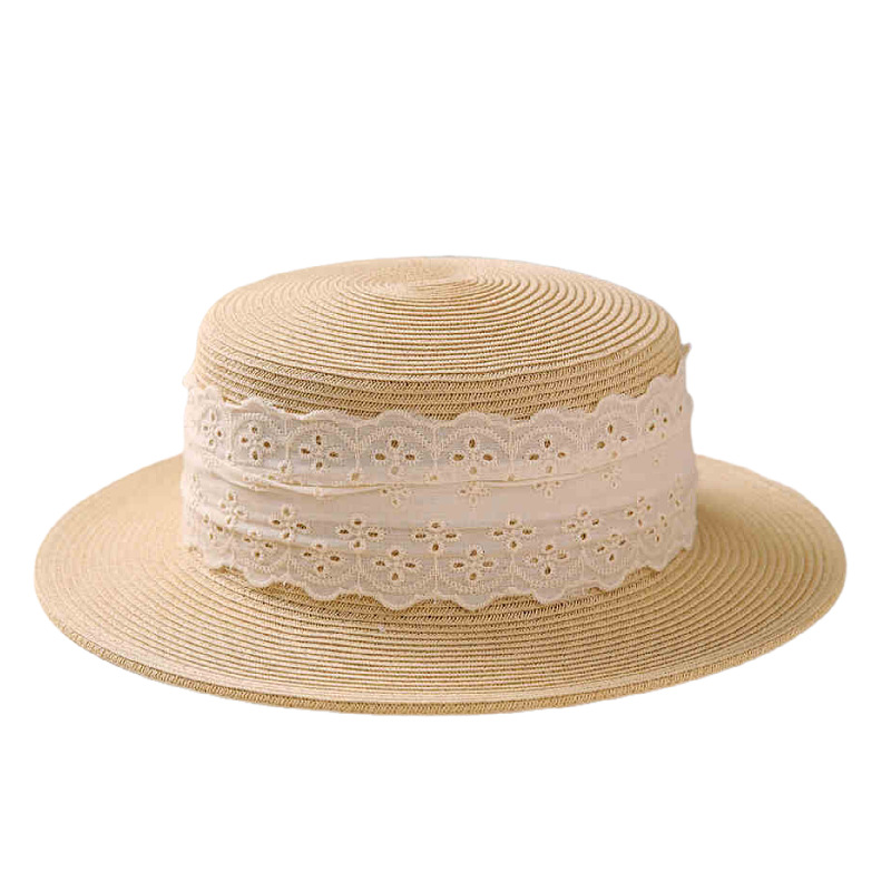 小清新蕾丝织带+卡其平顶草帽