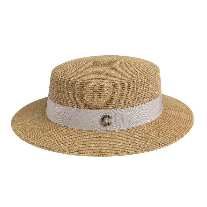 米色字母织带+卡其平顶草帽