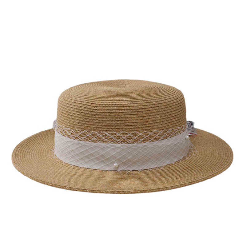 米色网纱织带+ 卡其平顶草帽