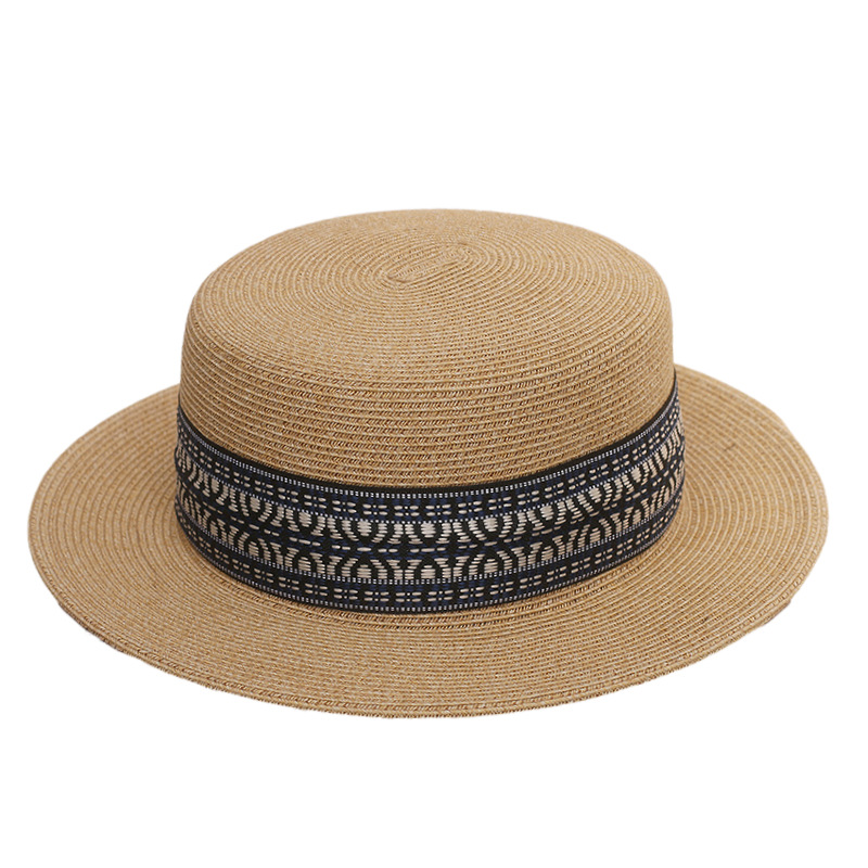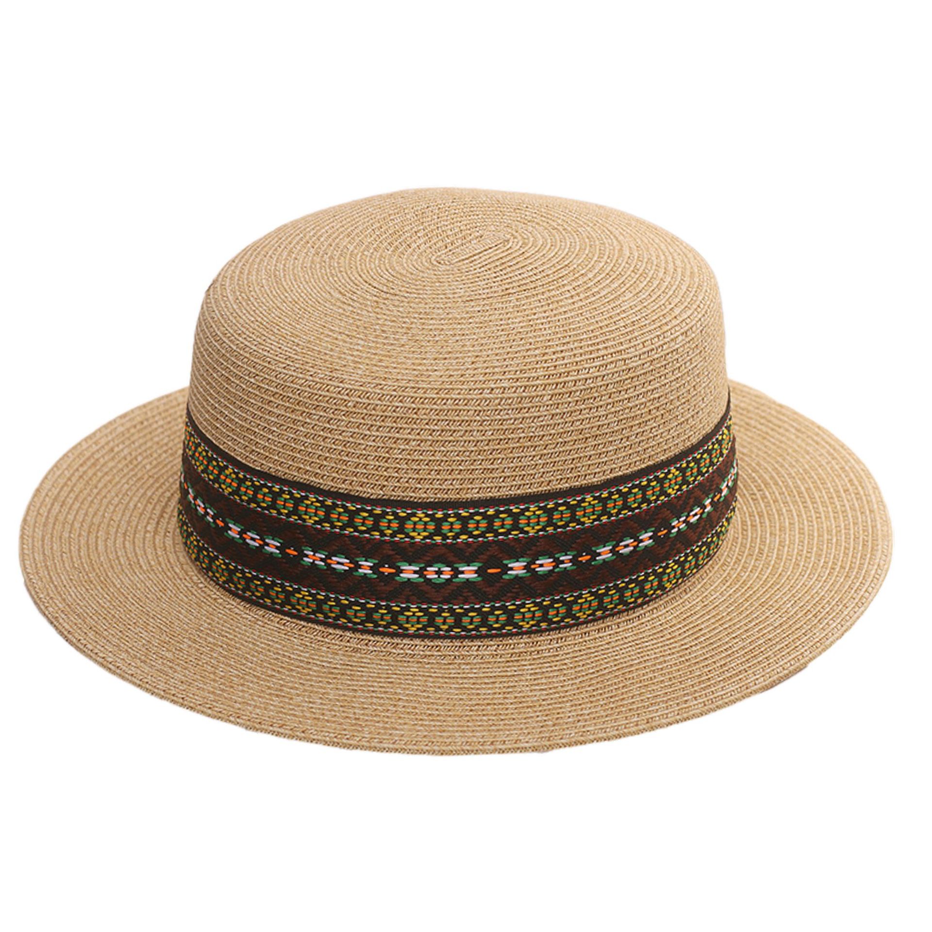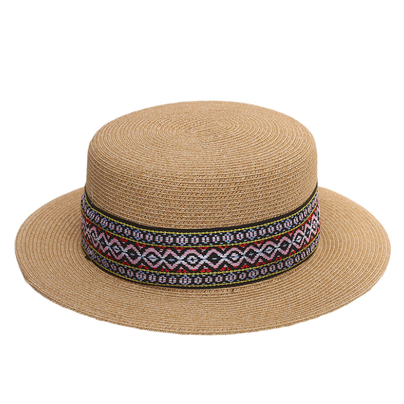 咖色民族风织带+卡其平顶草帽