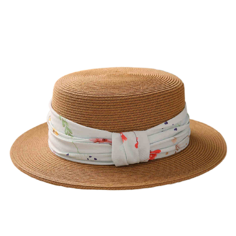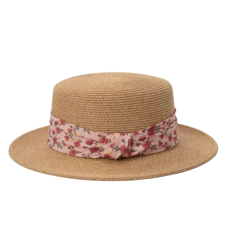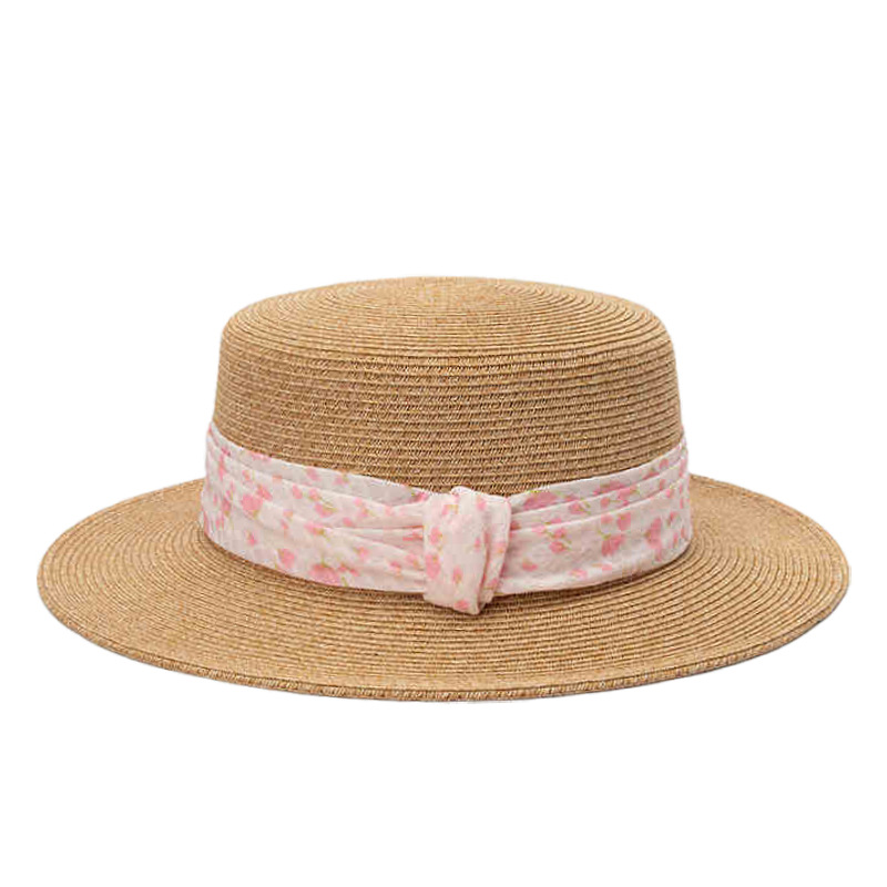 粉色碎花织带+ 卡其平顶草帽