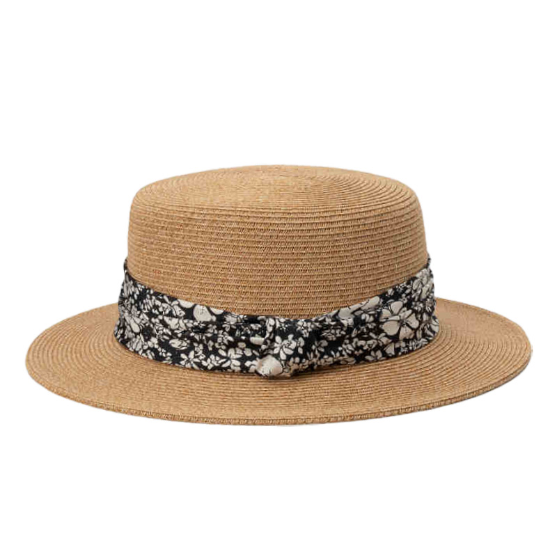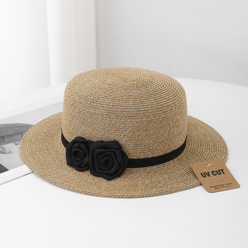 黑色花朵+卡其平顶草帽