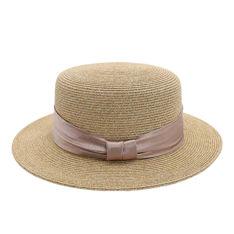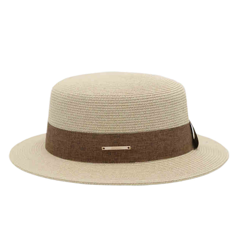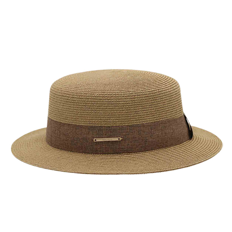 咖色三折织带+卡其平顶草帽