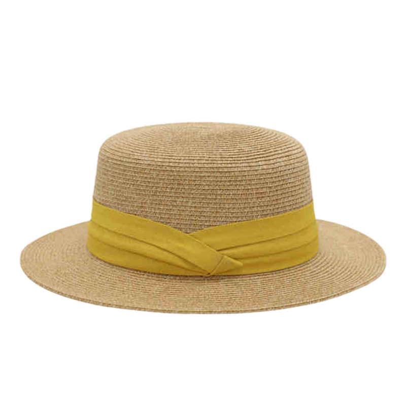 黄色三折织带+卡其平顶草帽
