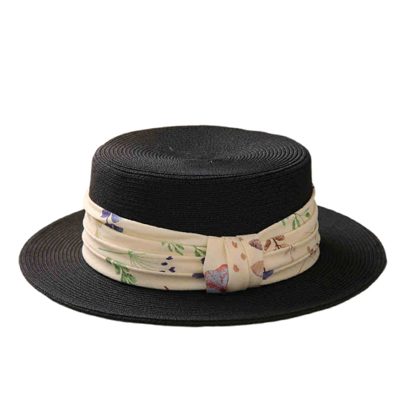 花朵褶皱织带+黑色平顶草帽