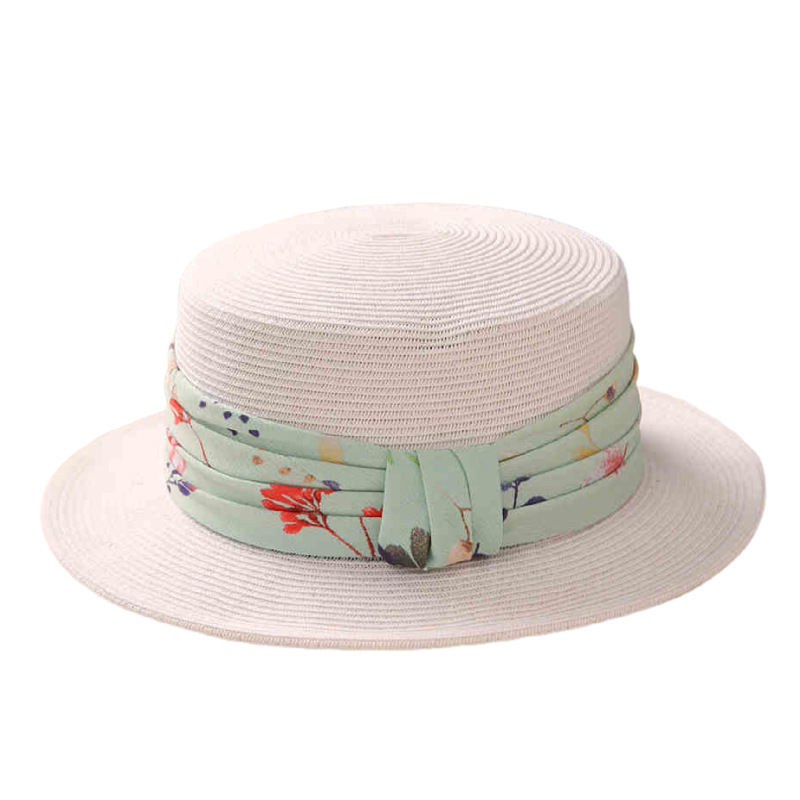 花朵褶皱织带+白色平顶草帽