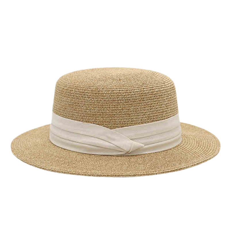 米色三折织带+卡其平顶草帽