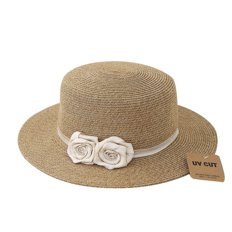 花朵褶皱织带+卡其平顶草帽