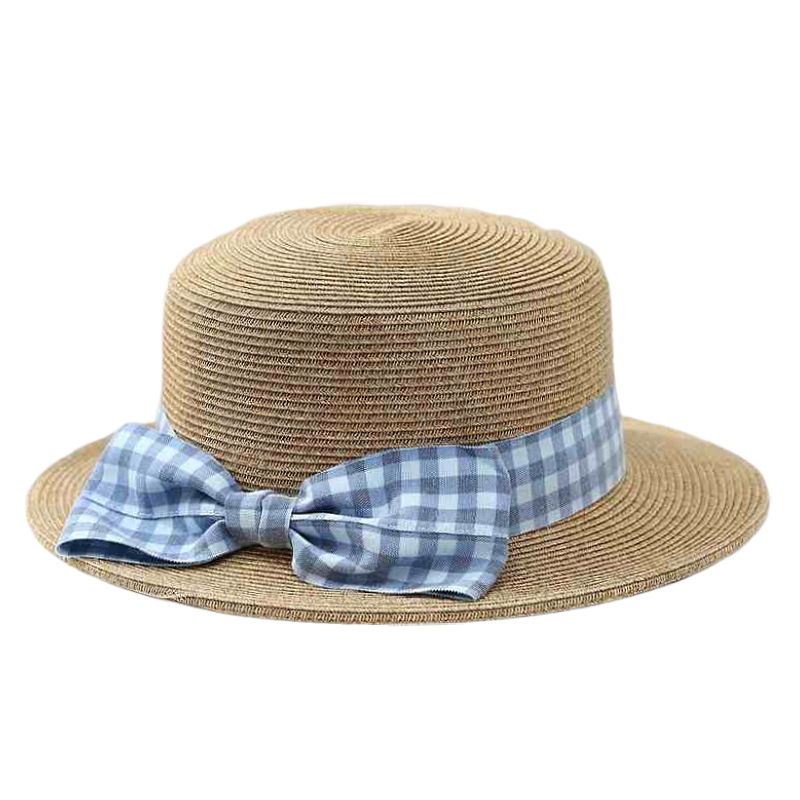 蓝色格子蝴蝶结+米色平顶草帽