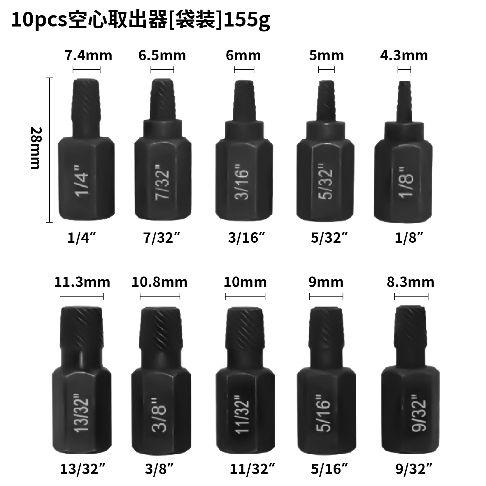 10pcs空心英制断头螺丝取出器套装塑袋装155g