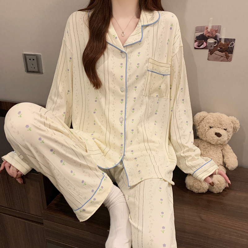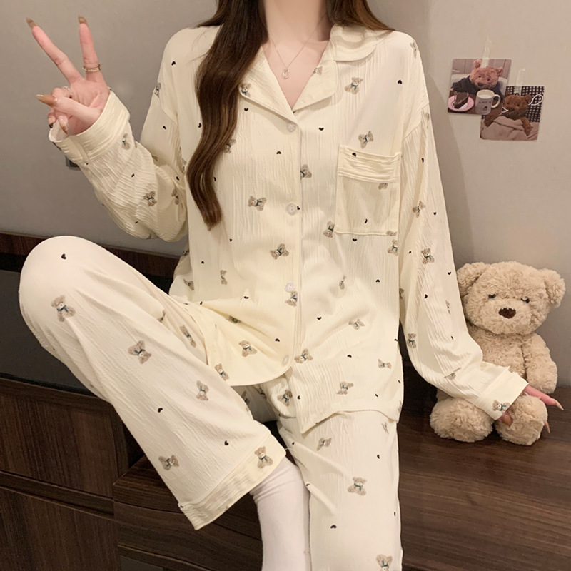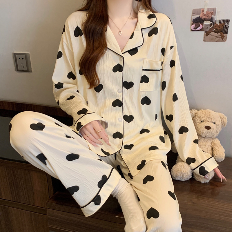 温柔风少女爱心开衫睡衣可外穿春季新款云朵棉皱布家居服长袖套装