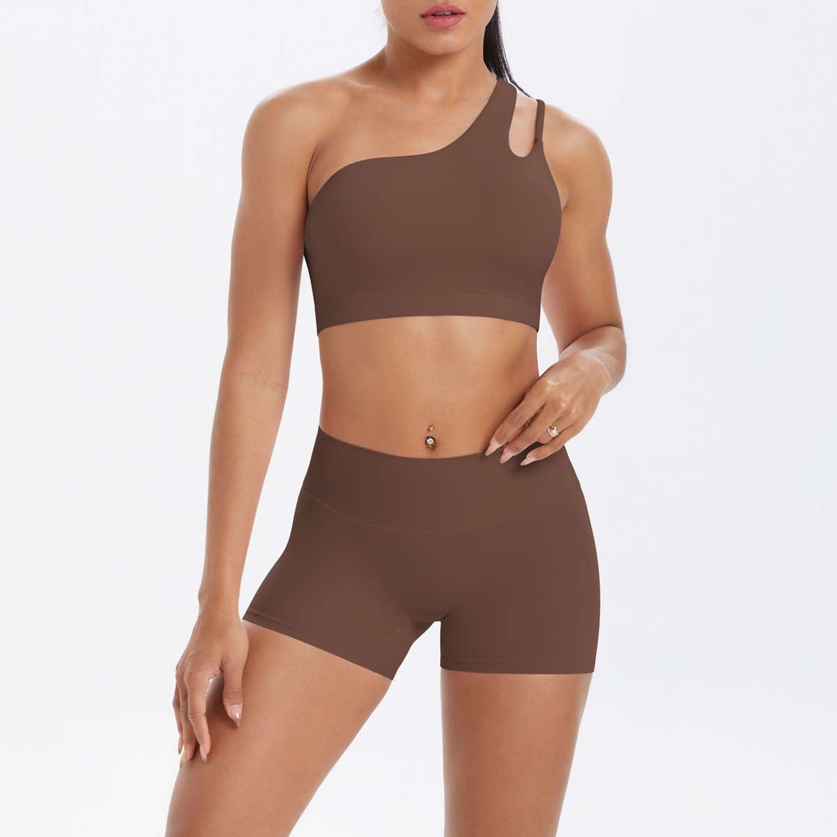 7114单肩文胸+7101短裤套装-板栗色