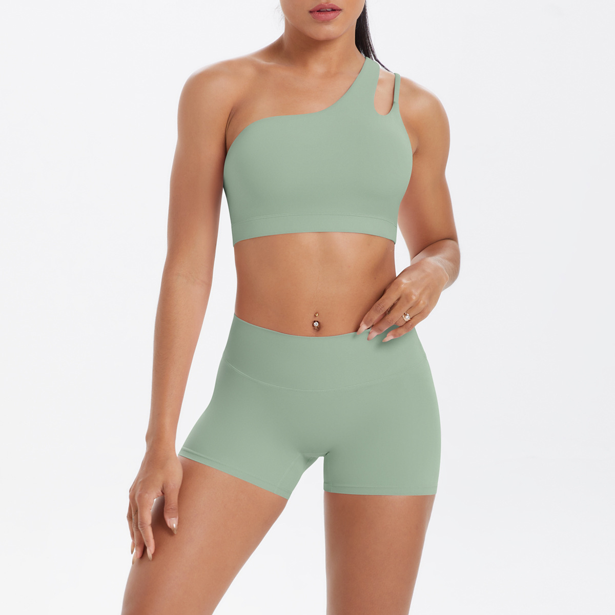7114单肩文胸+7101短裤套装-罗勒绿