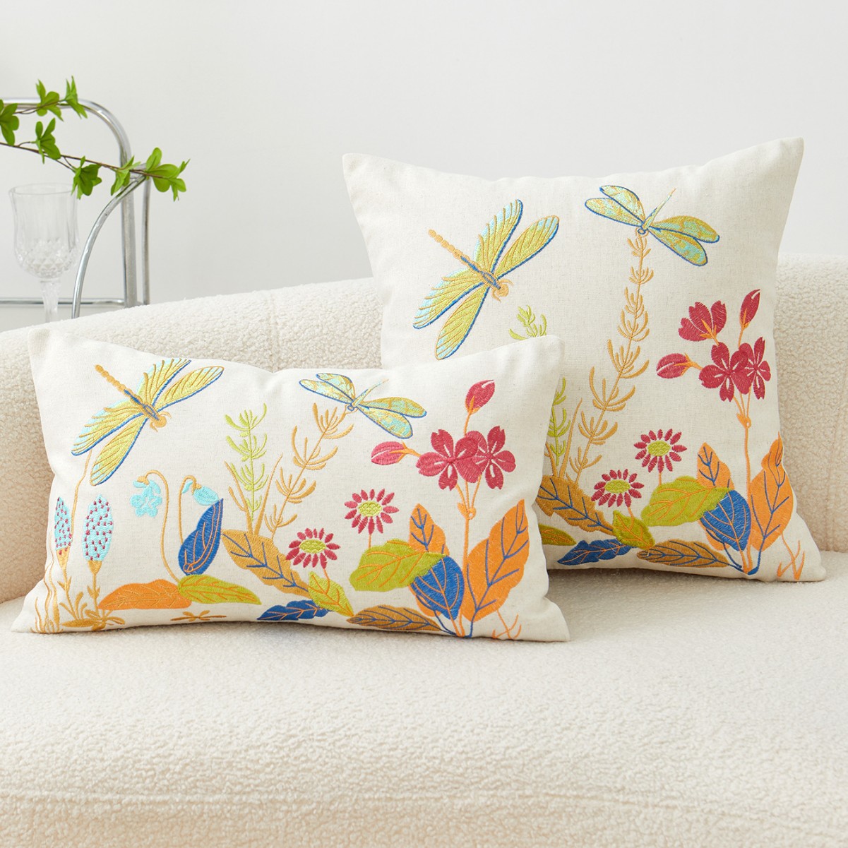 批发自然蜻蜓花朵刺绣抱枕套田园风单面沙发靠背靠垫家居不含枕芯