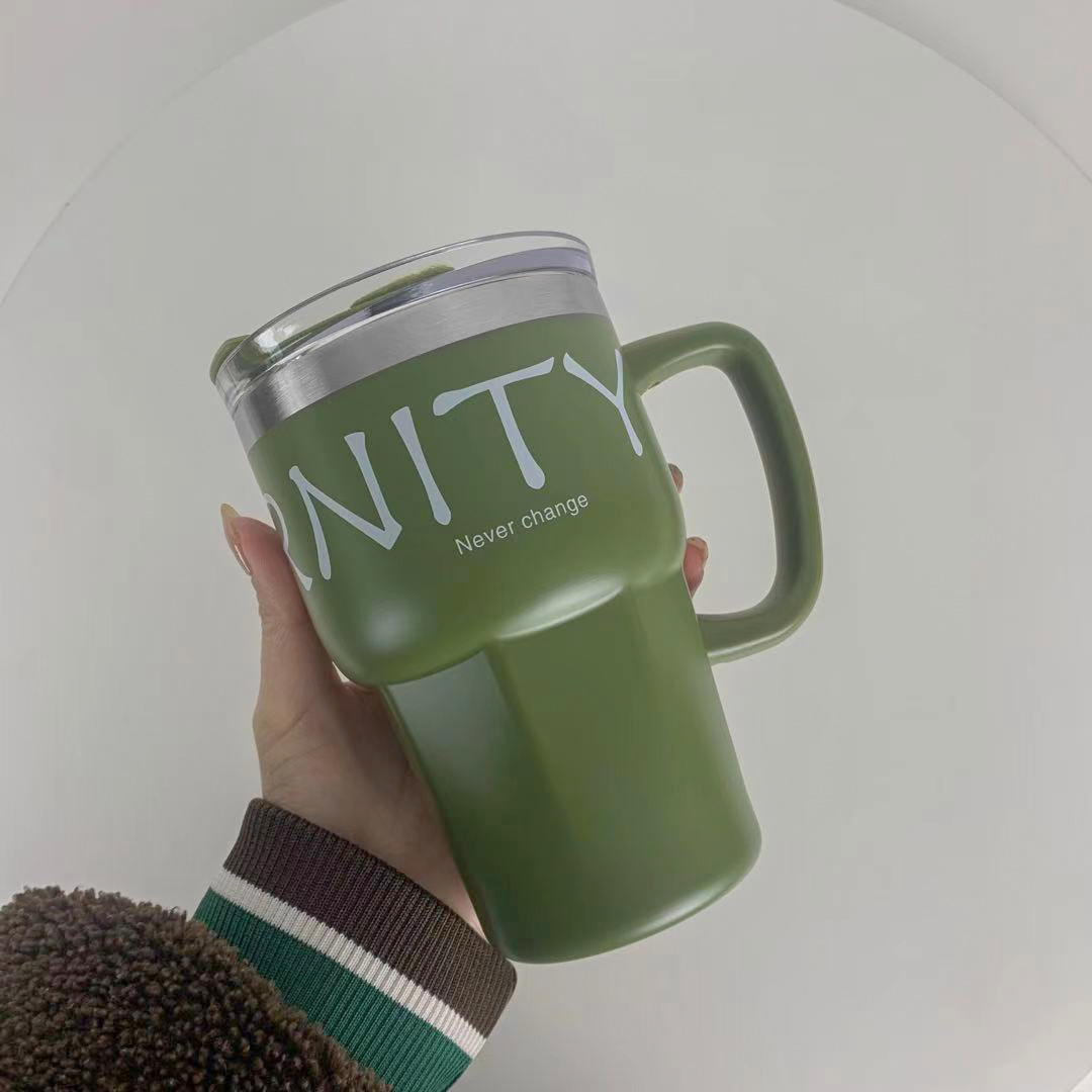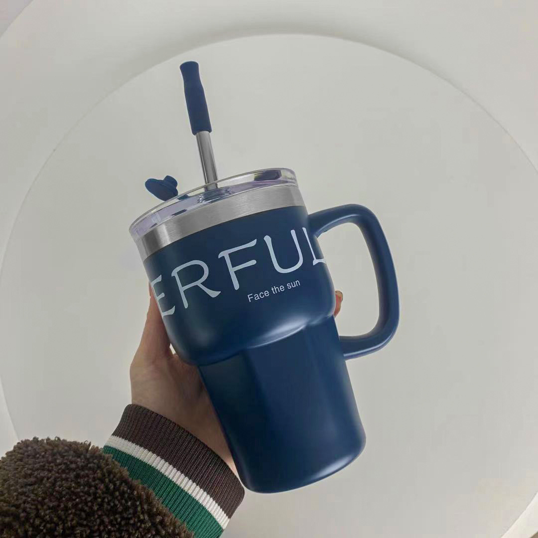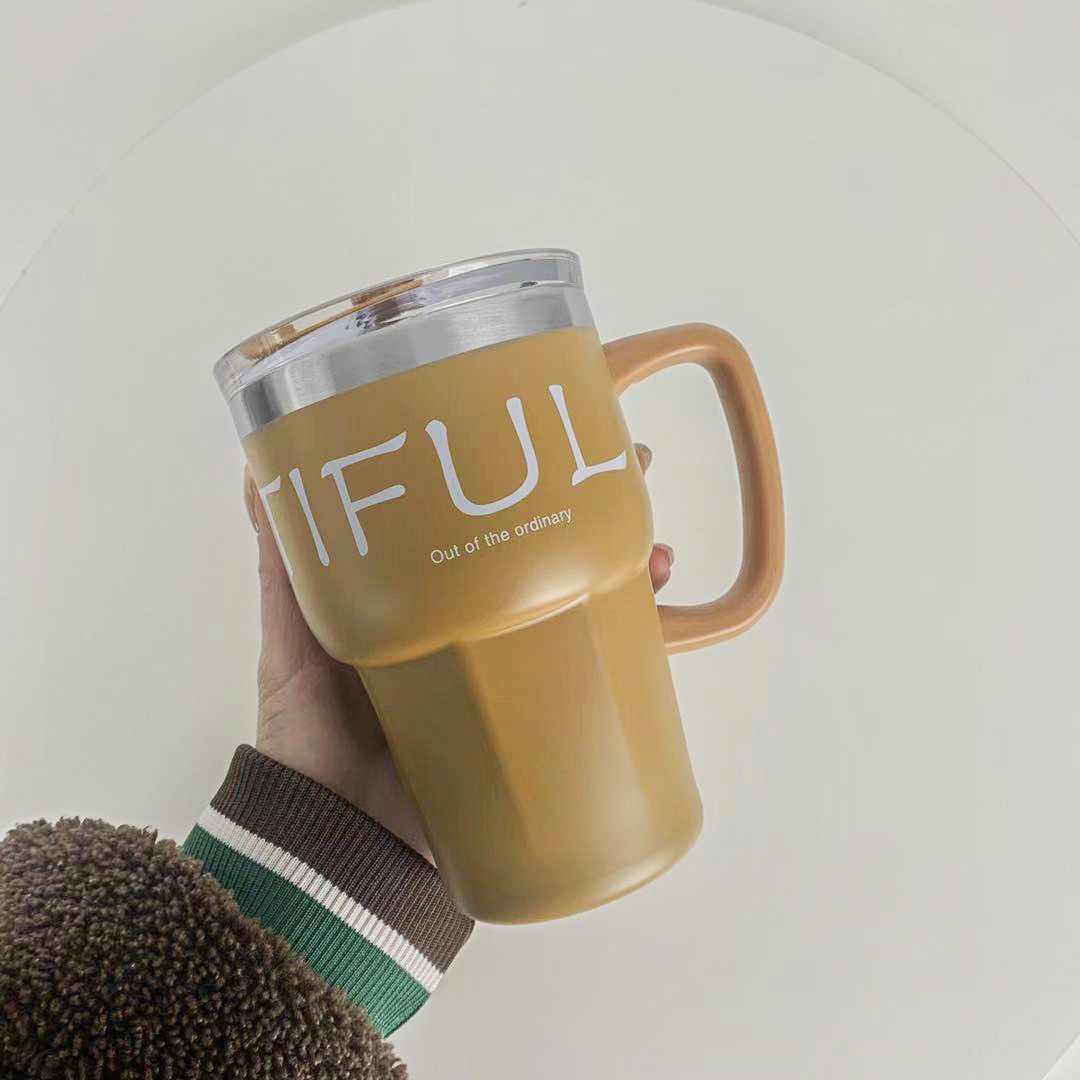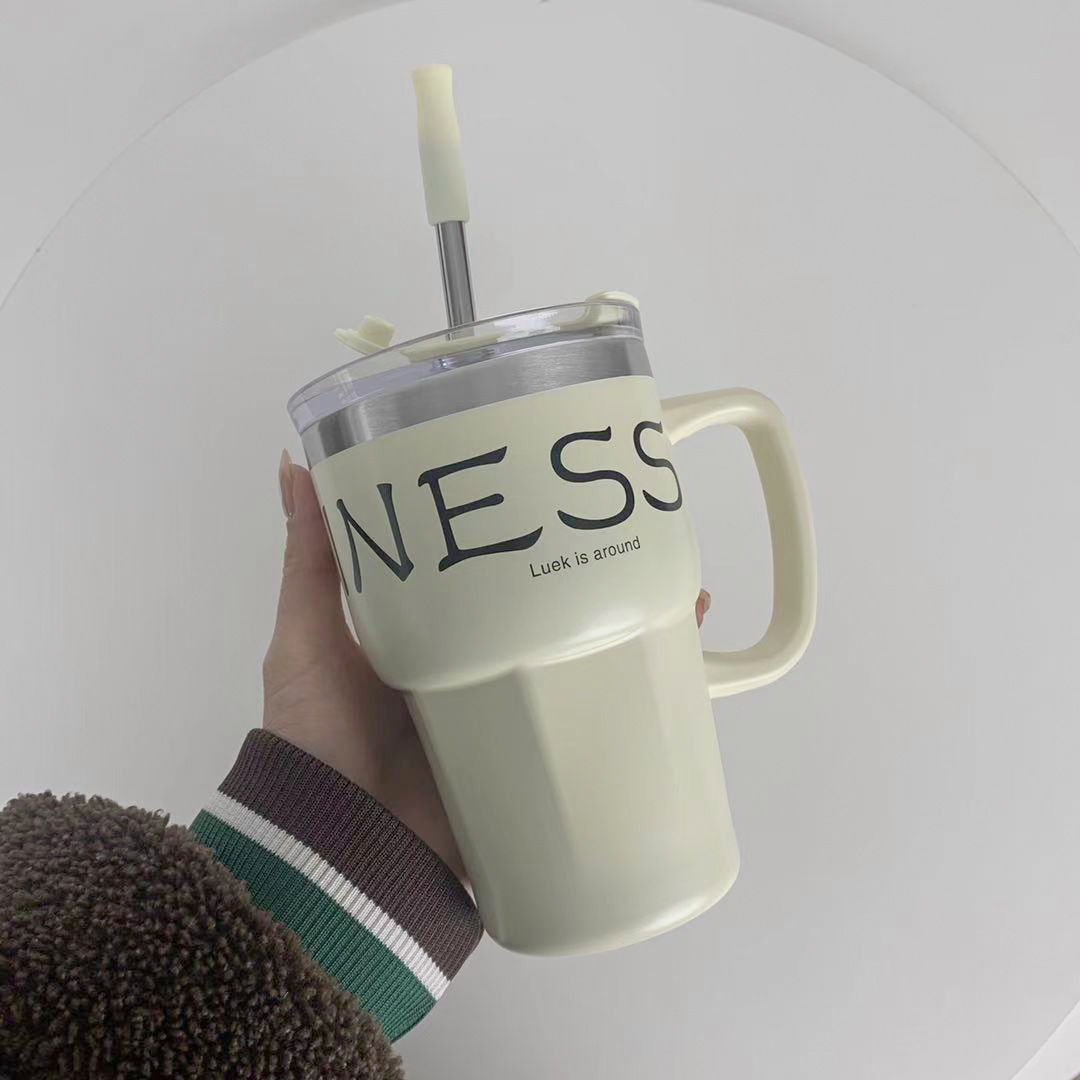 复古高颜值手柄办公咖啡杯大容量带吸管简约时尚不锈钢水杯保冷