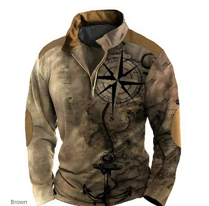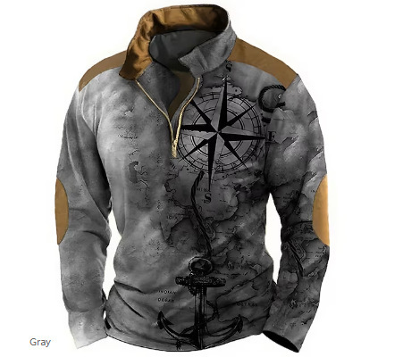 2023跨境欧美长袖民族风3d印花半拉链男Polo衫