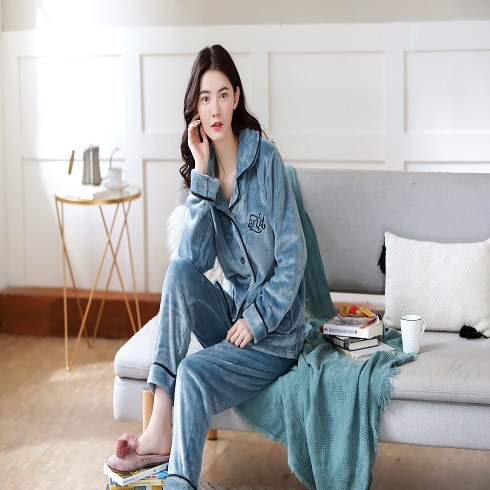 睡衣女秋冬季珊瑚绒长袖加绒加厚中年大码简约女士家居套装