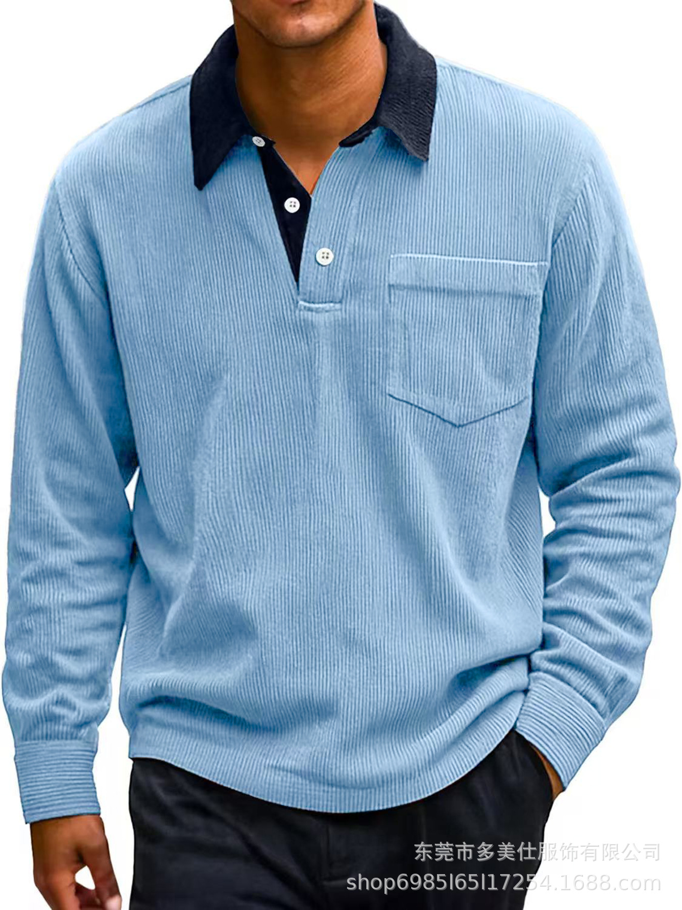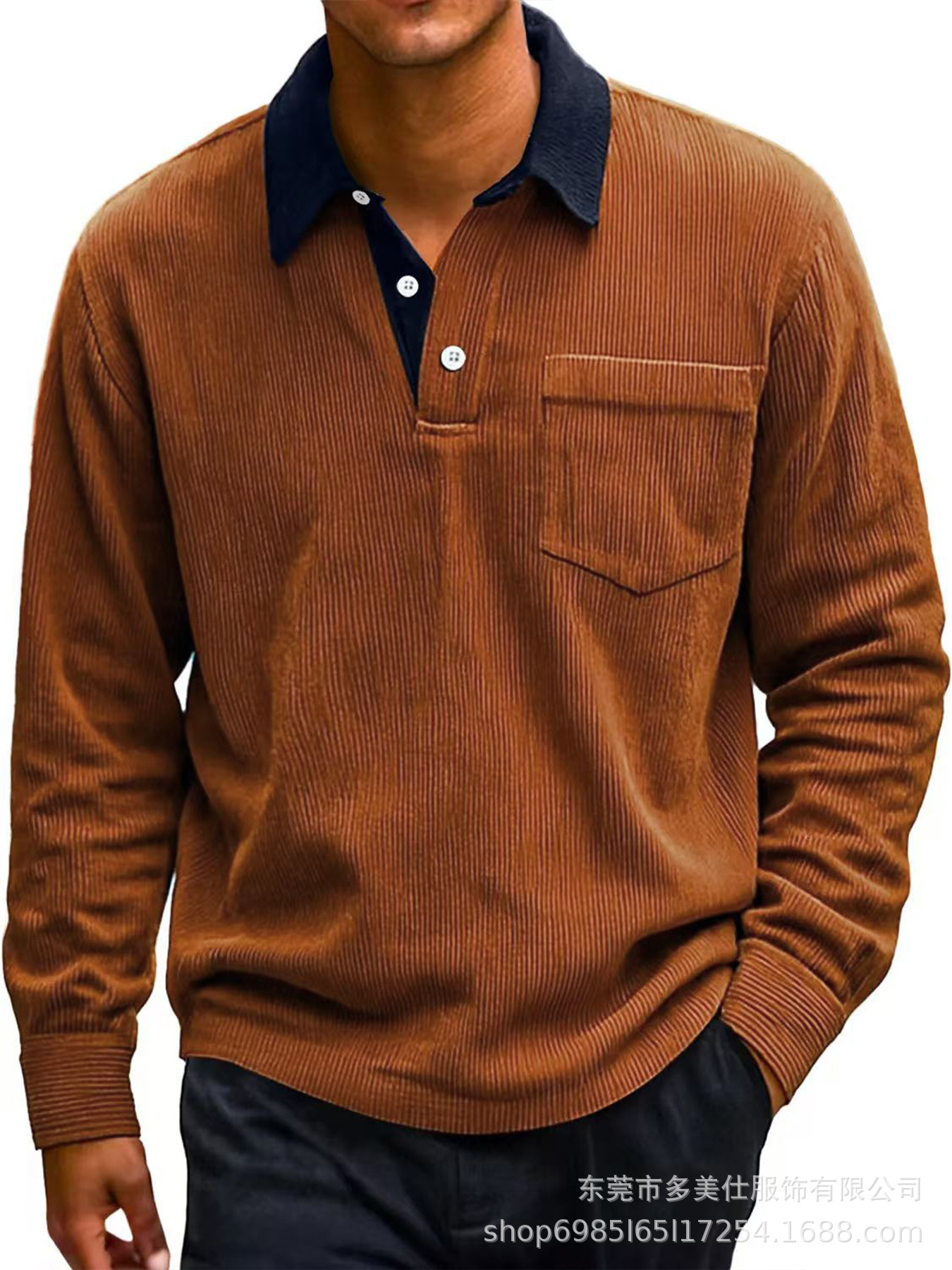 2025欧美秋冬季新款男士复古灯芯绒纽扣口袋拼色休闲长袖Polo衫男