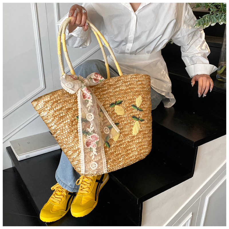 新款草编包麦草蕾丝编织包大容量沙滩包单肩新款手提休闲花朵女包
