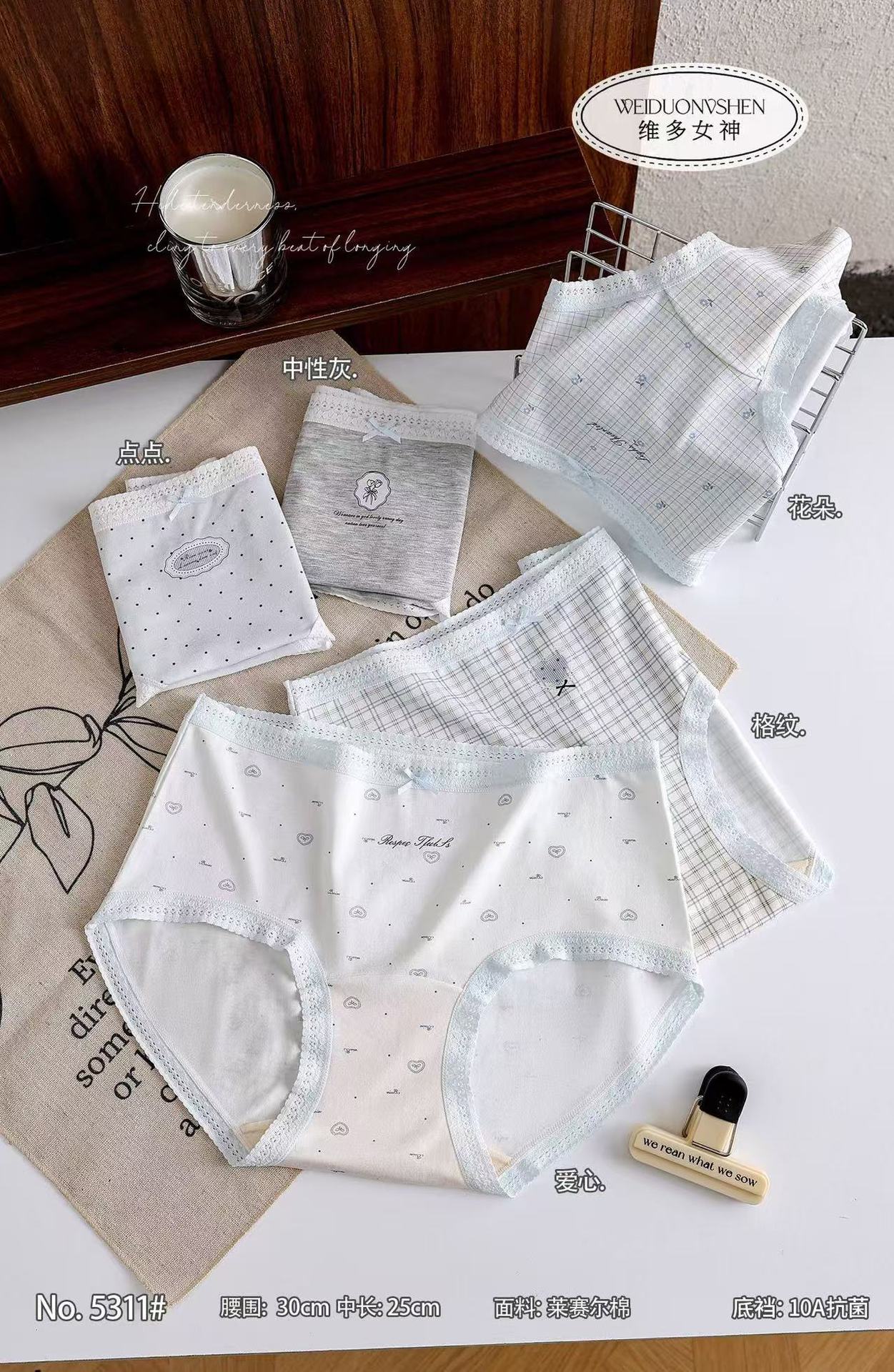 2026春夏新款蓝系格纹女生内裤透气柔软莱赛尔棉女士三角裤裆