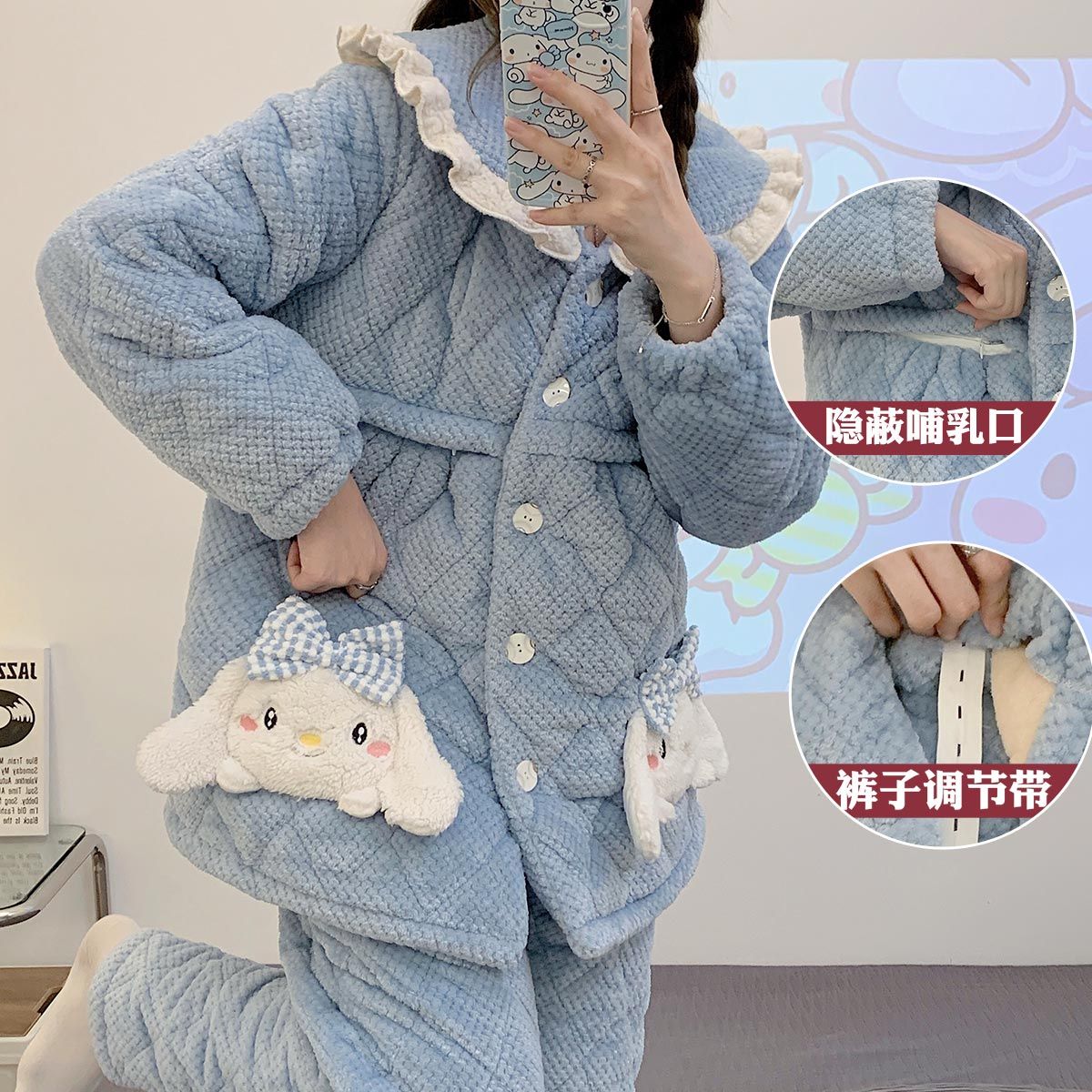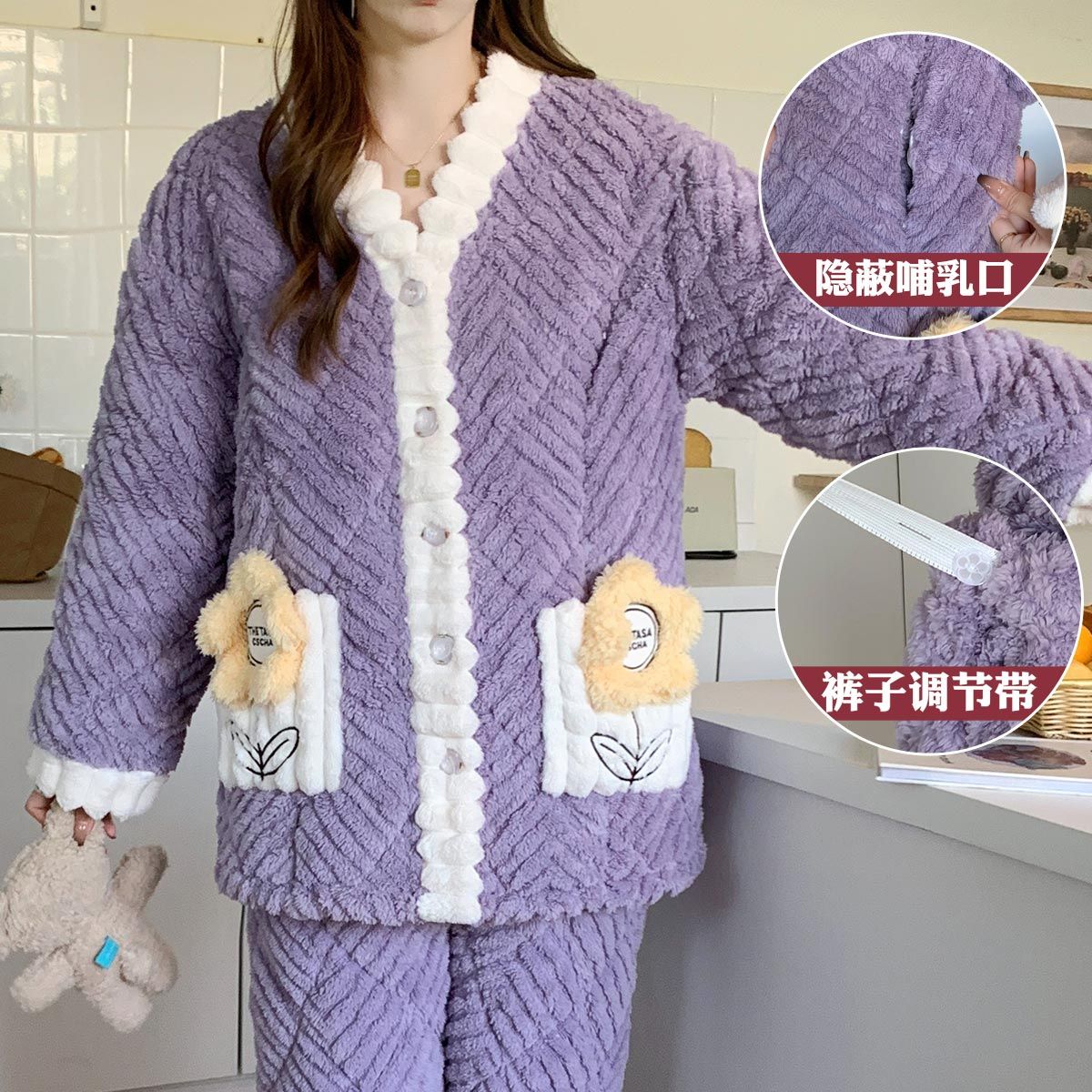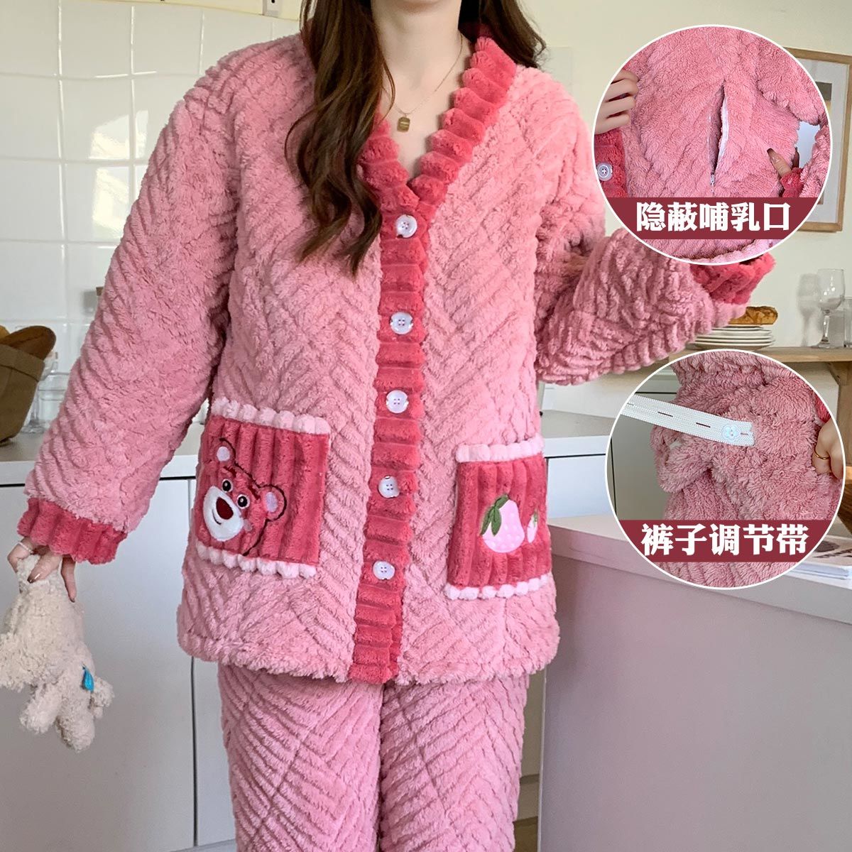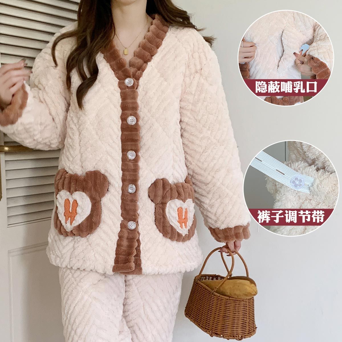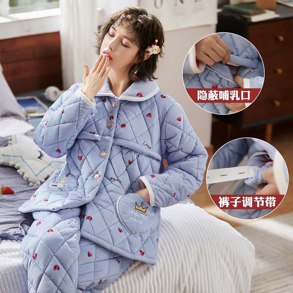 跨境孕妇睡衣秋冬季加厚加绒珊瑚绒月子服产后喂奶哺乳期衣服三层