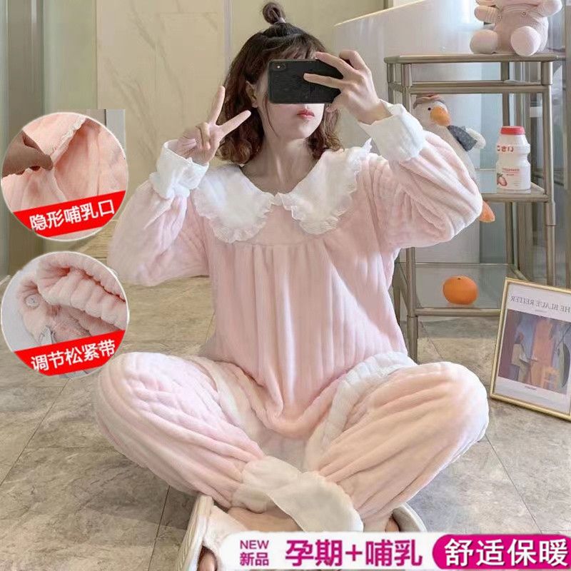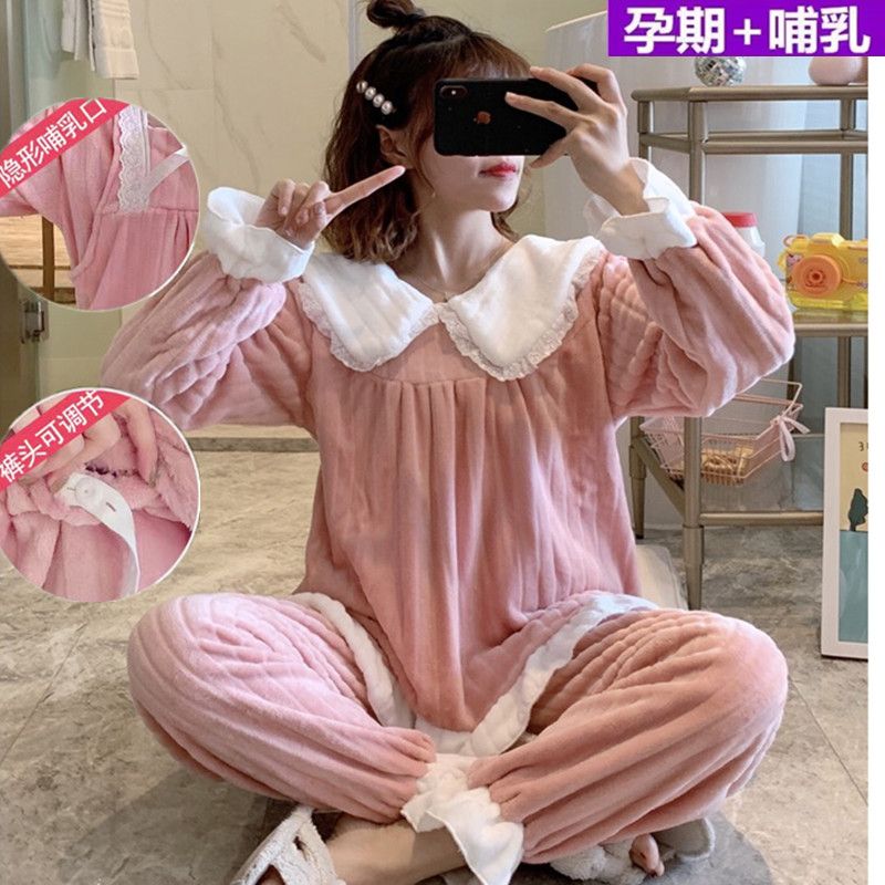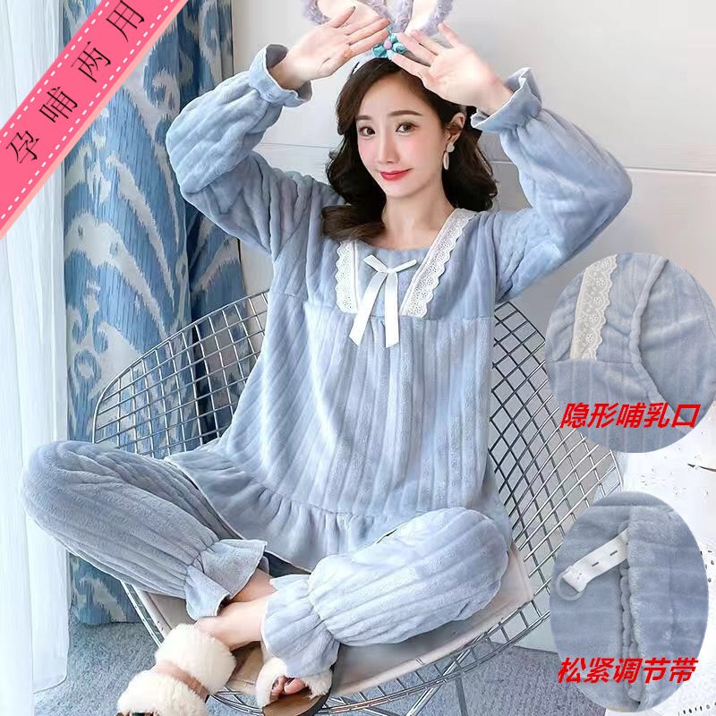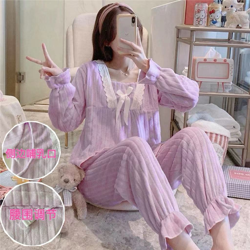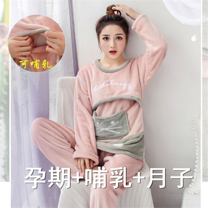 孕妇睡衣女秋冬季法兰绒加厚加绒产后月子服喂奶哺乳衣怀孕期套装