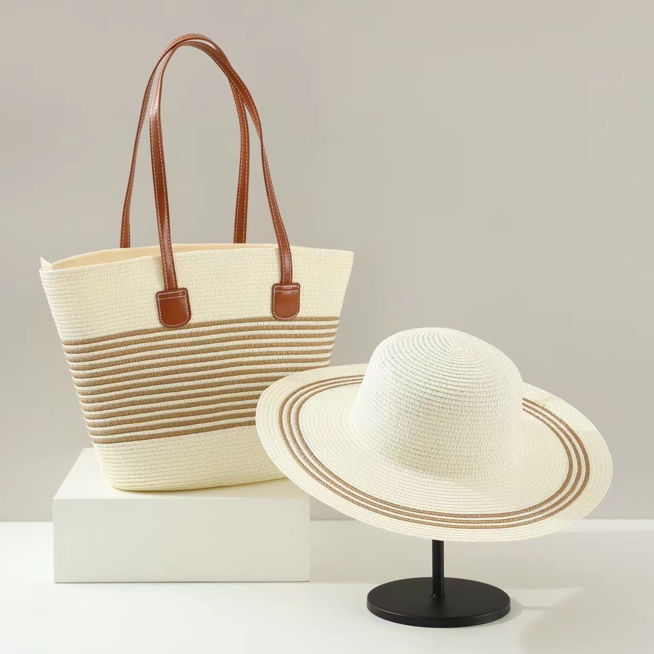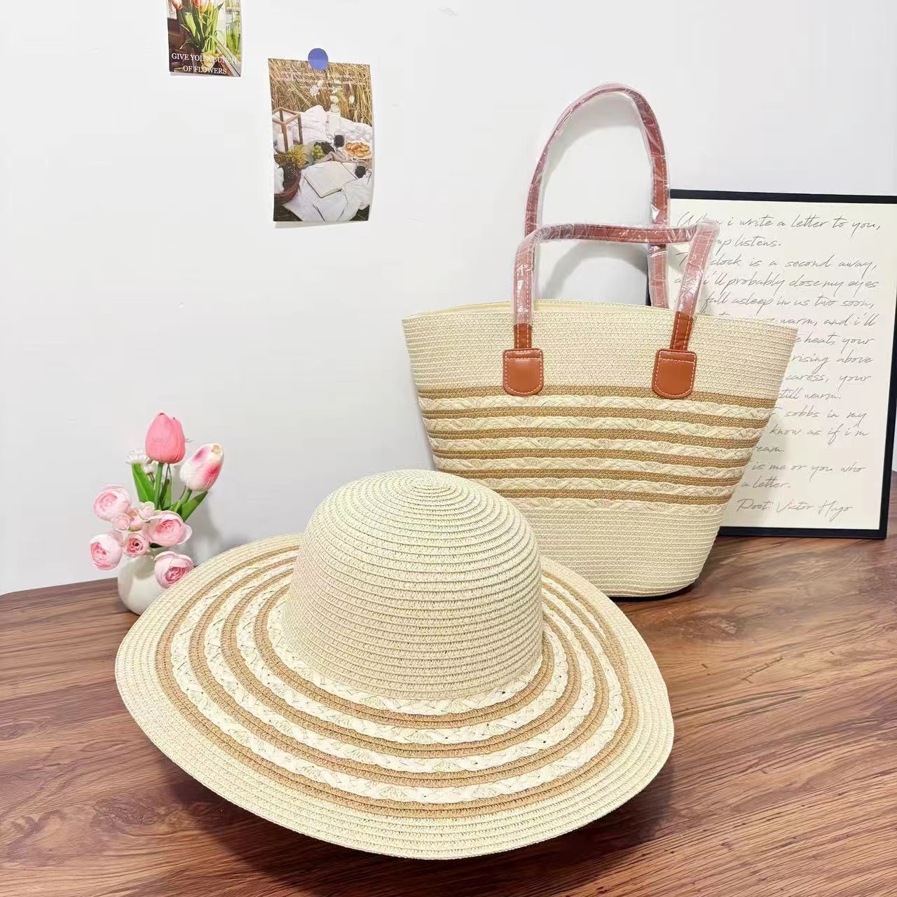 厂家直供外贸爆款草帽草编包两件套 大帽檐防晒帽女士条纹单肩包