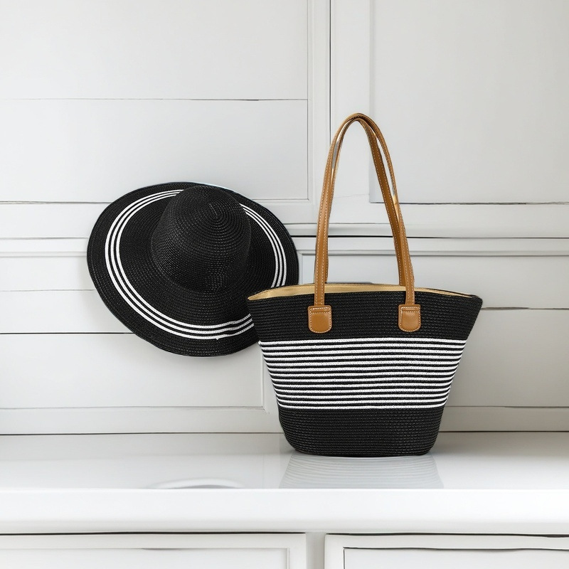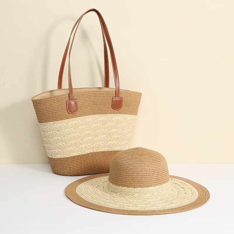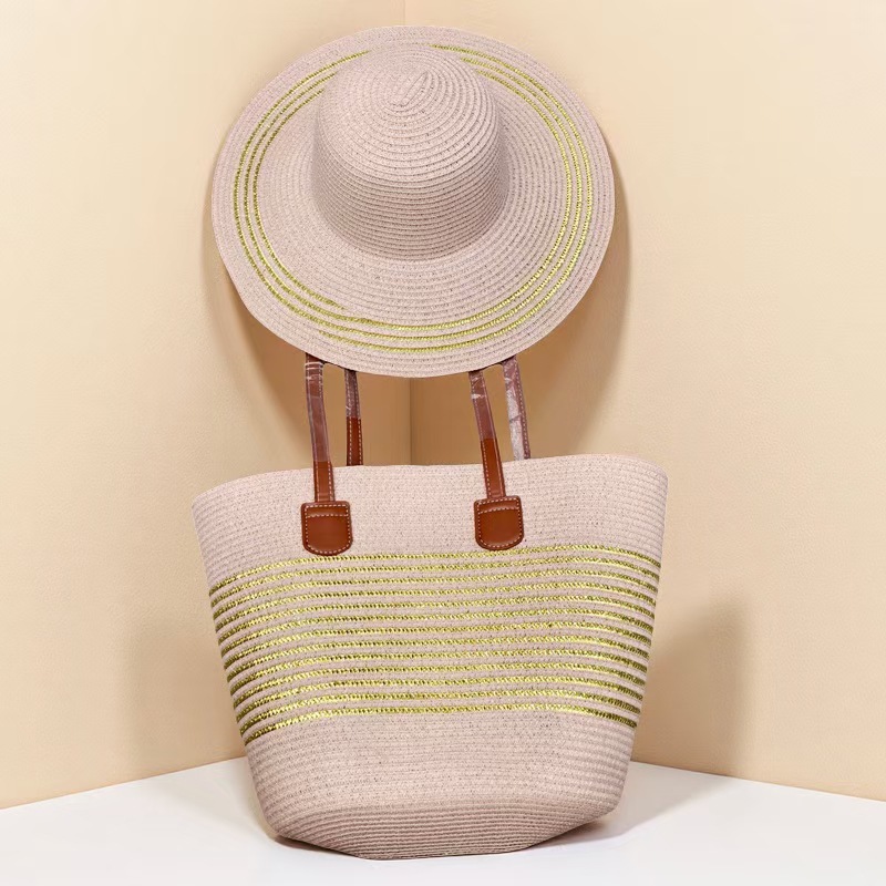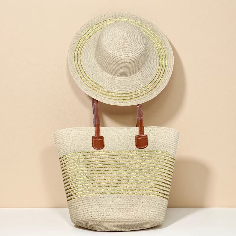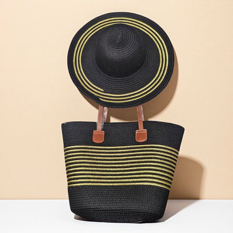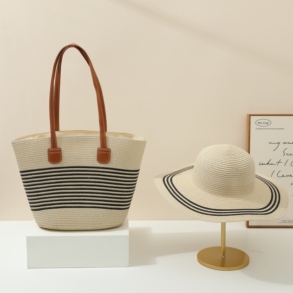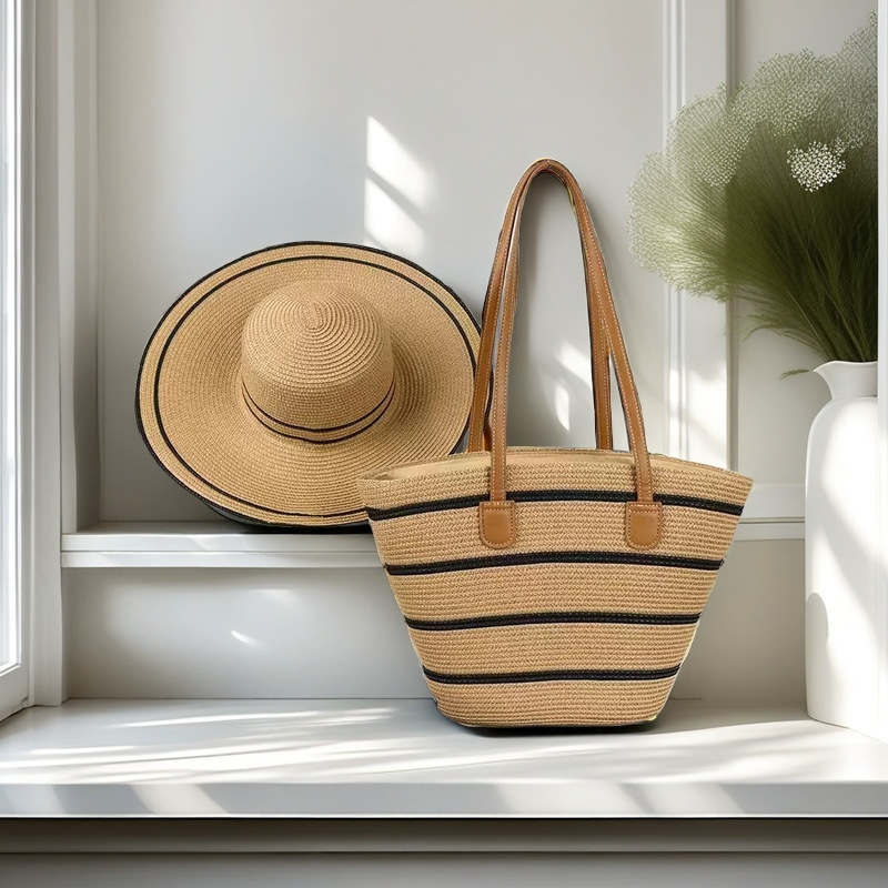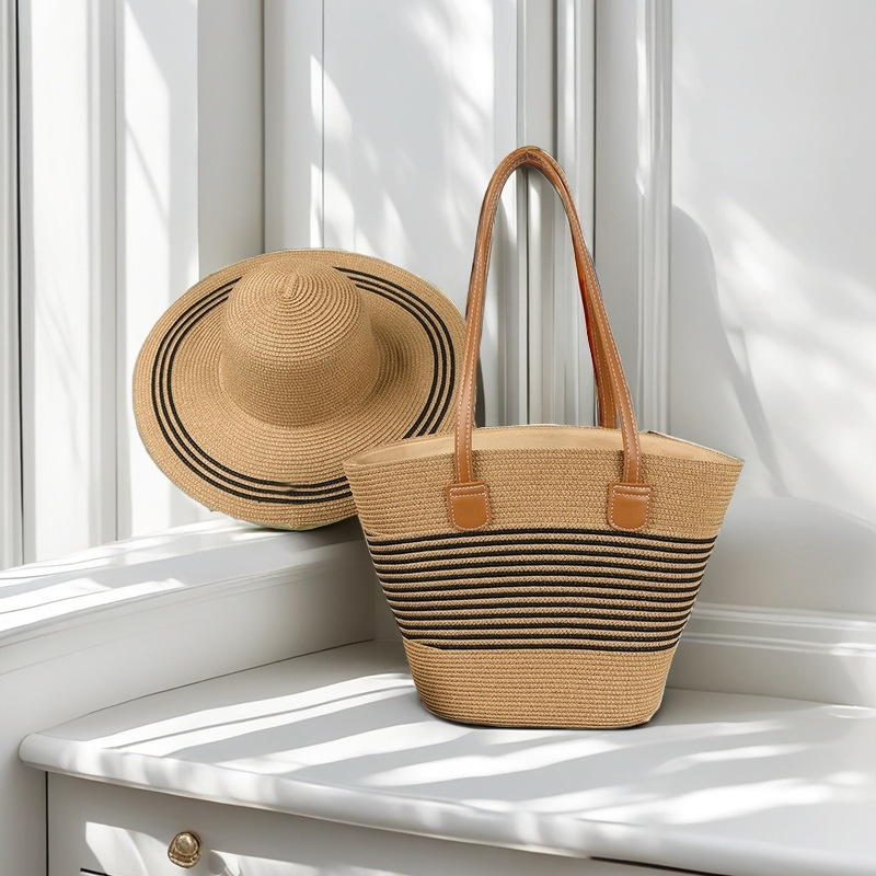 跨境草帽草编包两件套遮阳帽大容量条纹托特包单肩包沙滩包工厂店