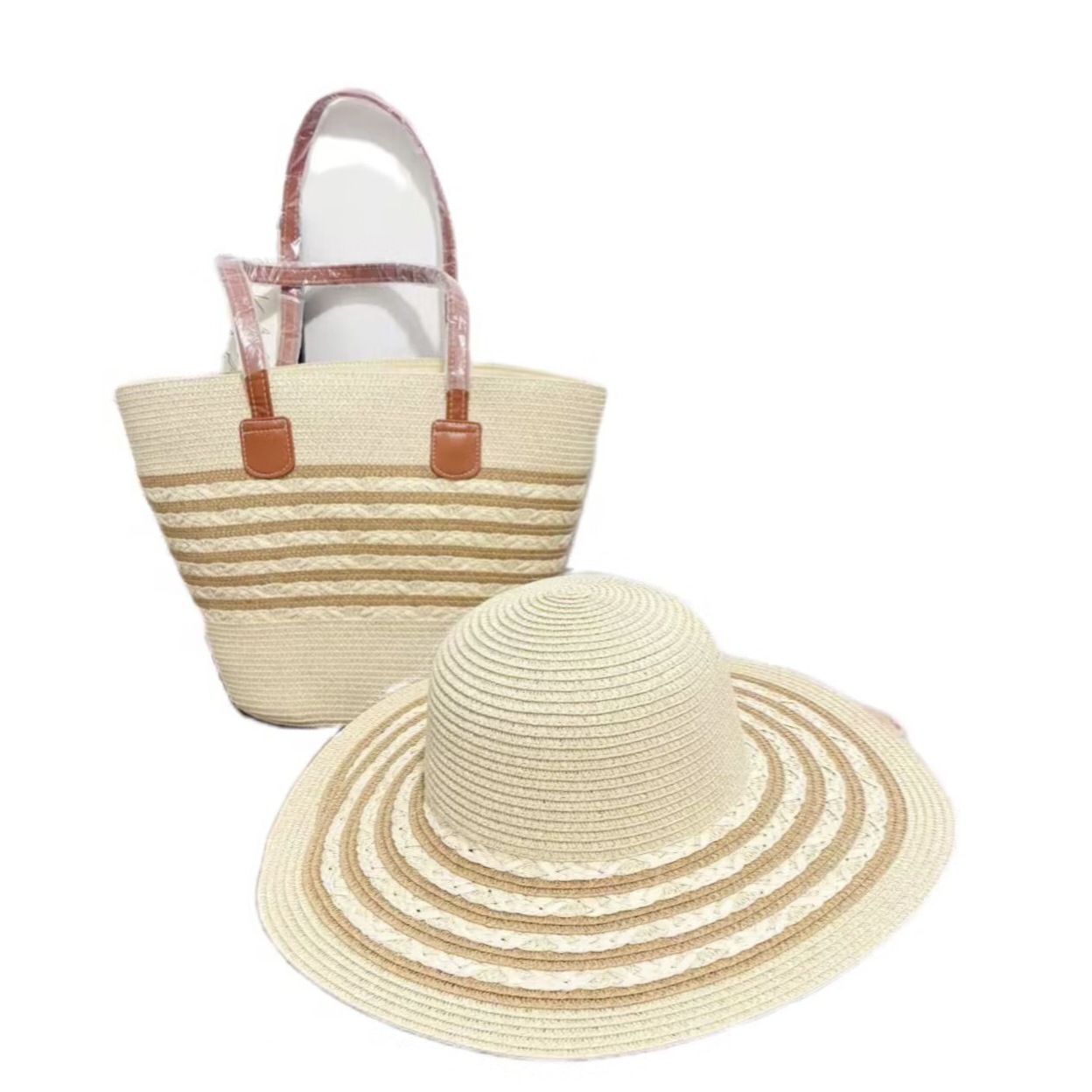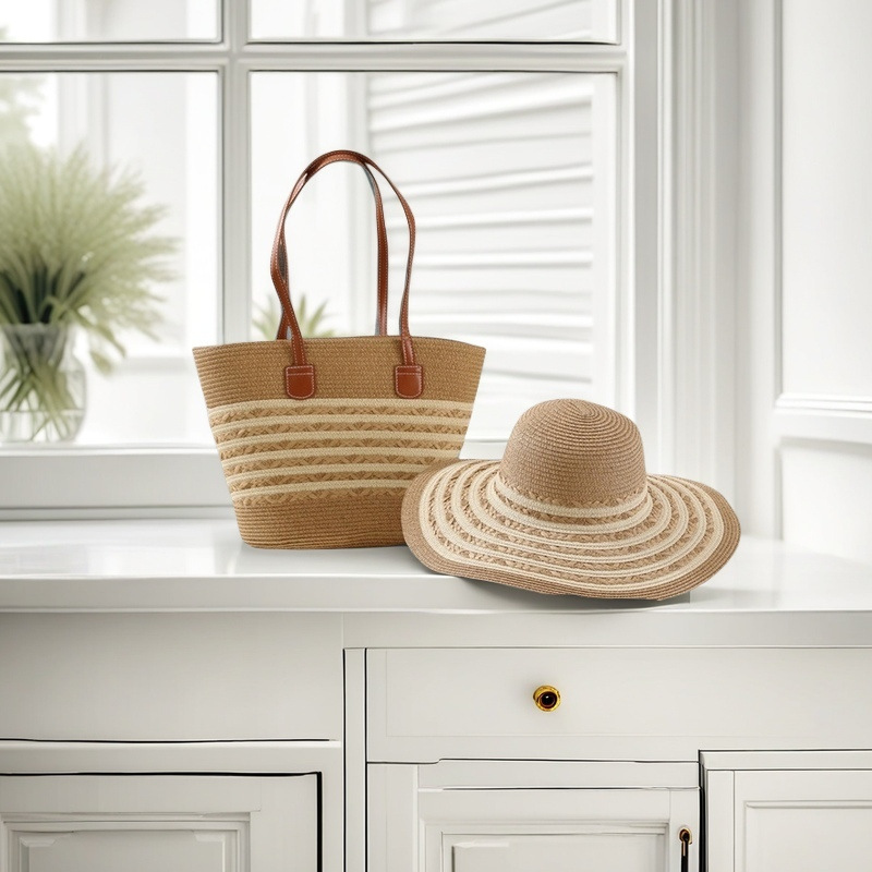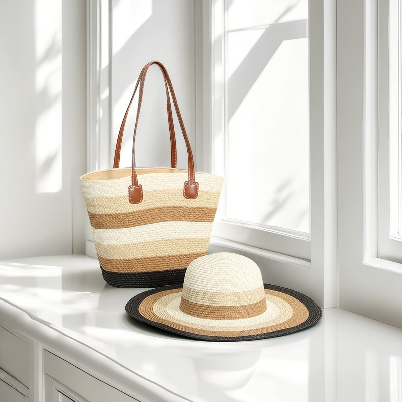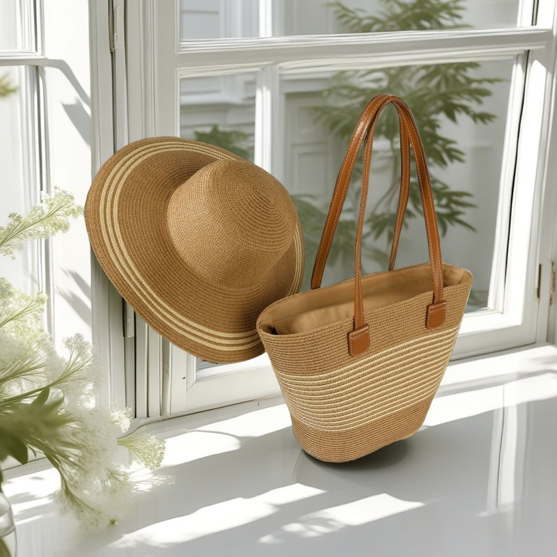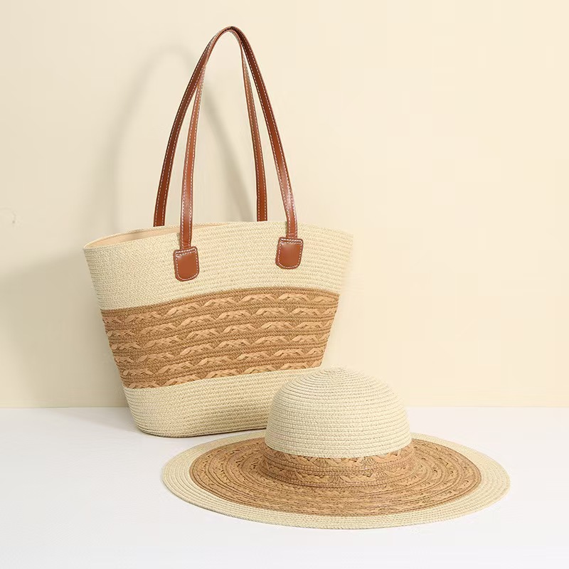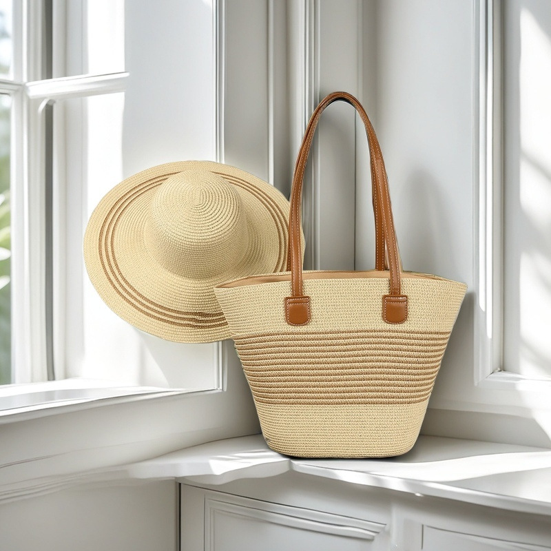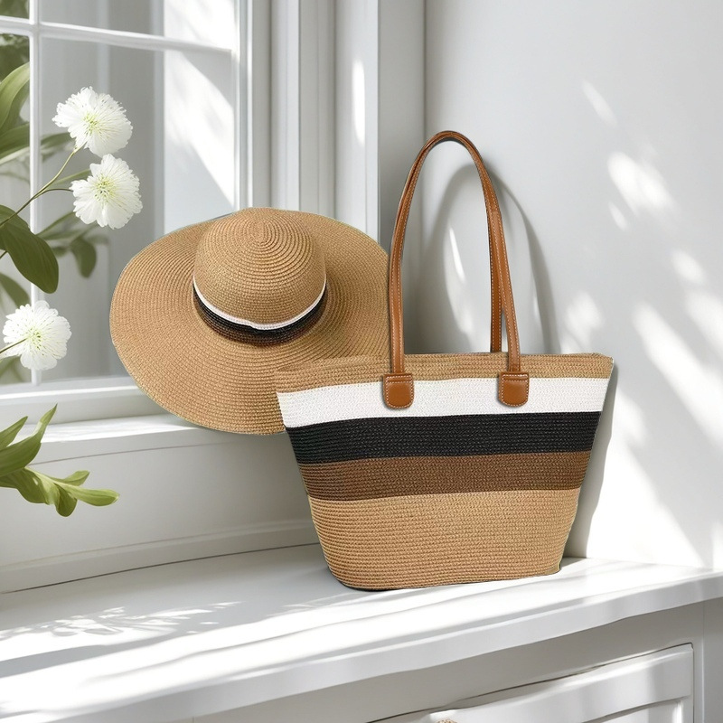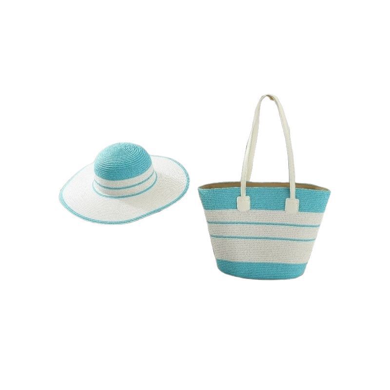 跨境草帽草编包两件套遮阳帽大容量条纹托特包单肩包沙滩包工厂店