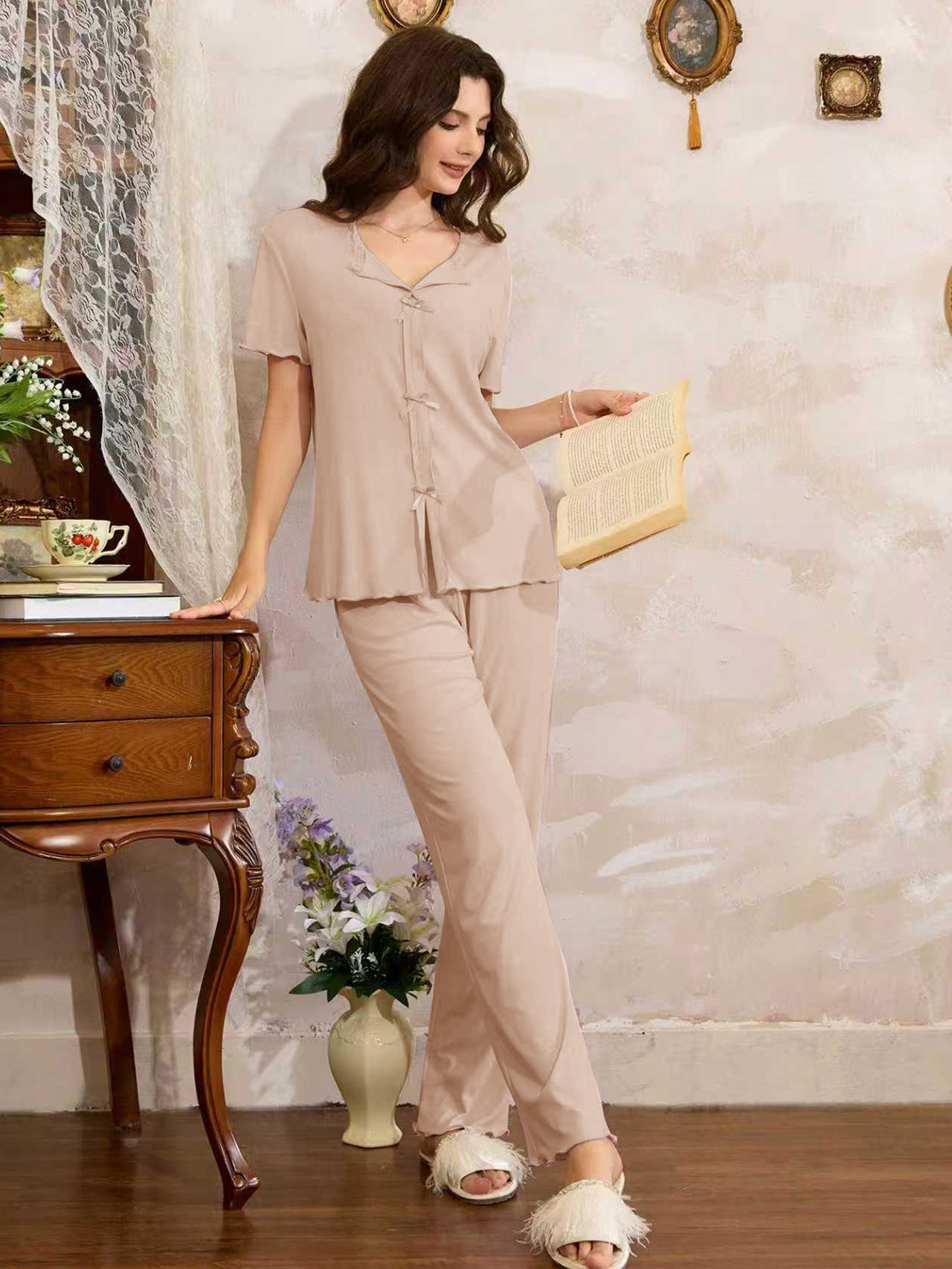 亚马逊速卖通新款跨境春夏短袖和长裤纯色休闲睡衣套装可外穿