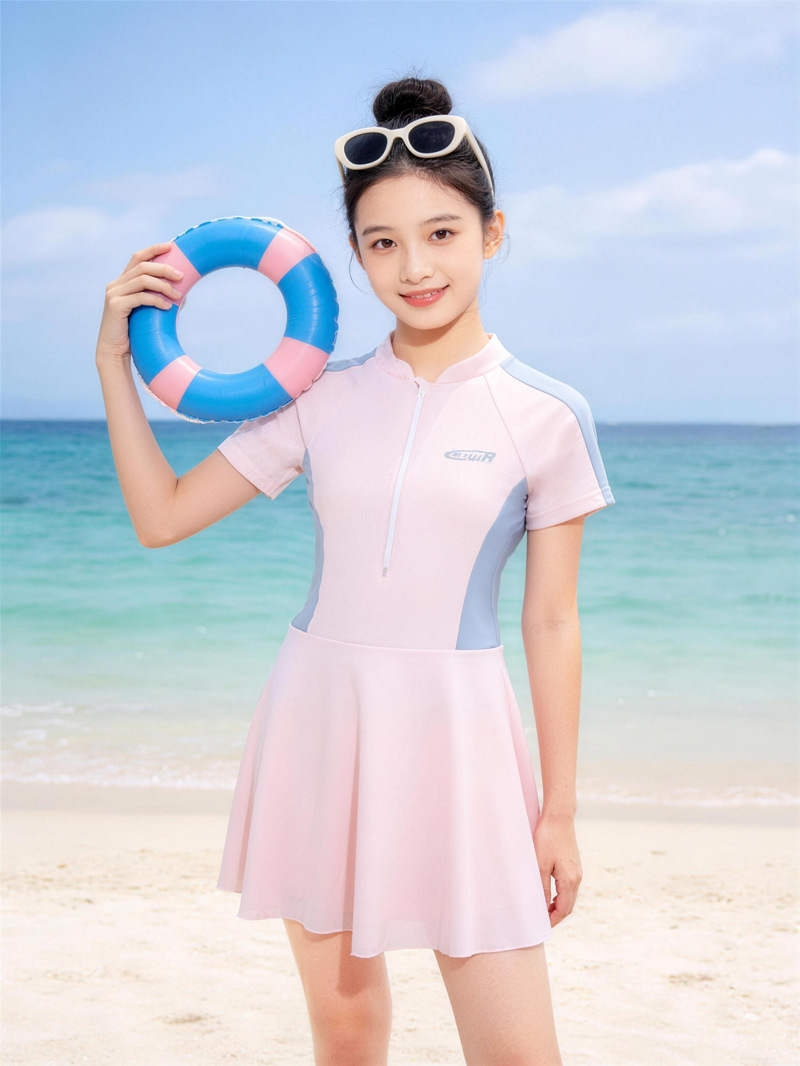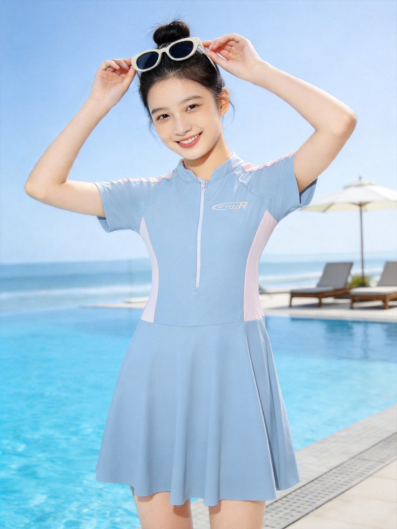 2026新款女童连体裙式泳衣短袖防晒显瘦遮肚学生泳装涤纶带胸垫