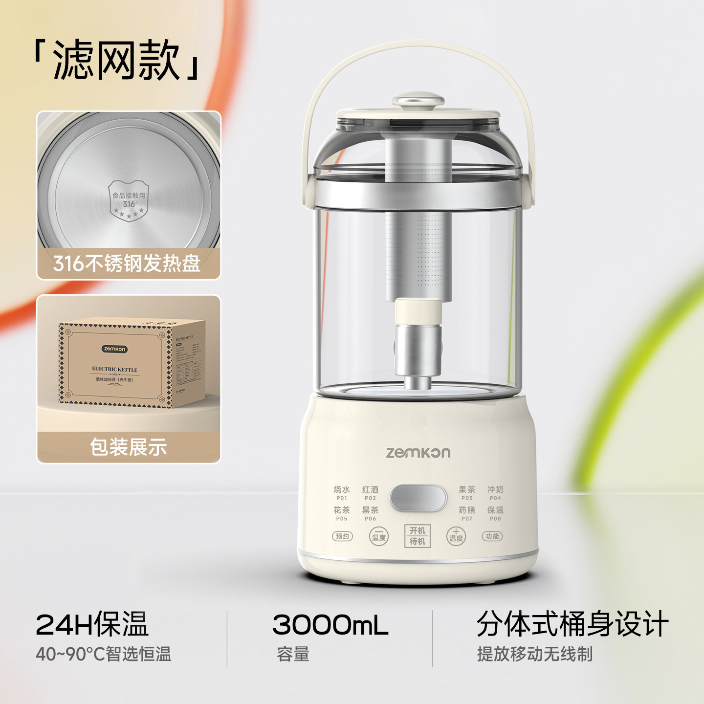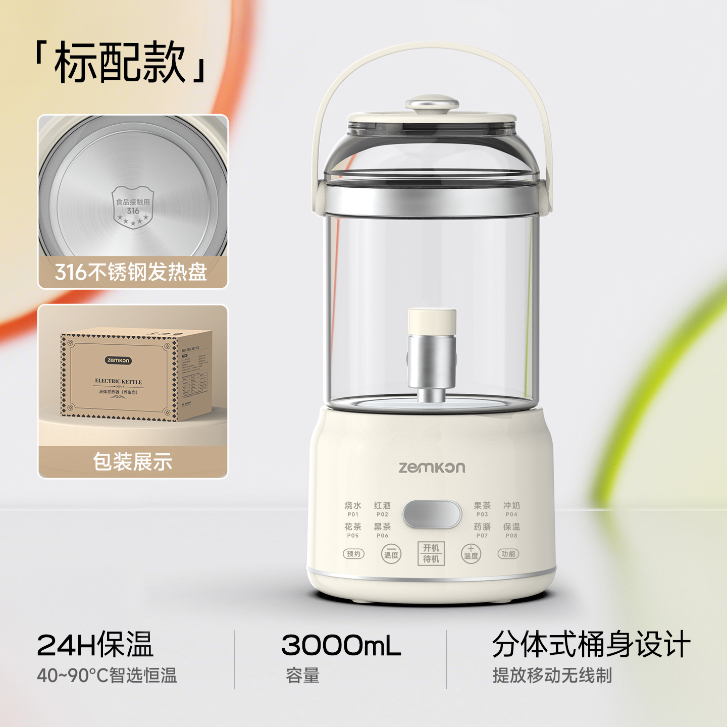 Zemkon家用3L养生壶炖煮一体花茶壶恒温玻璃智能全自动电热烧水壶