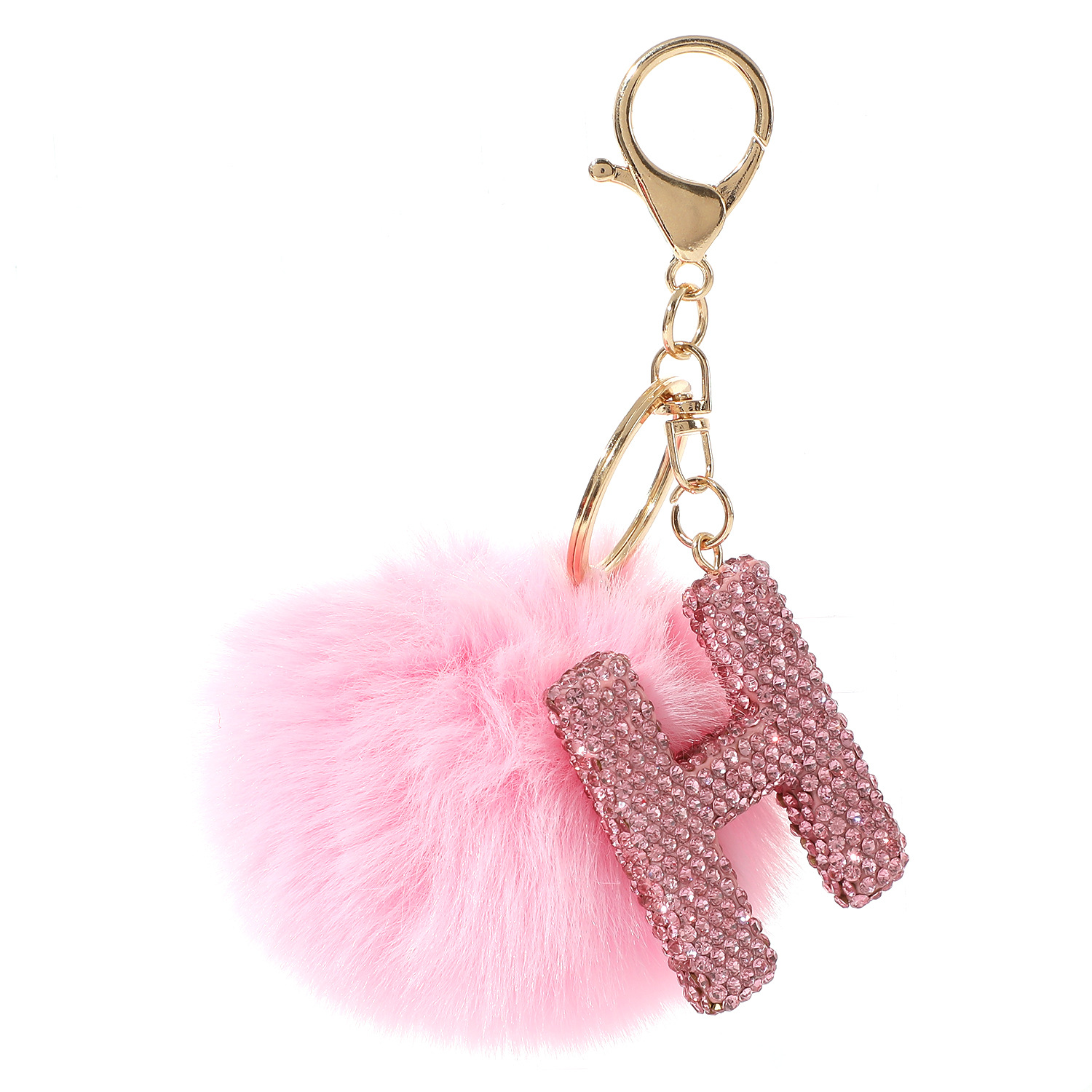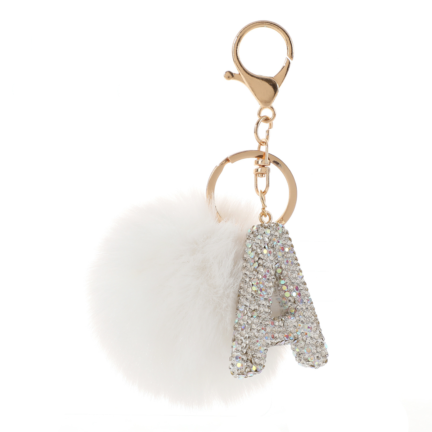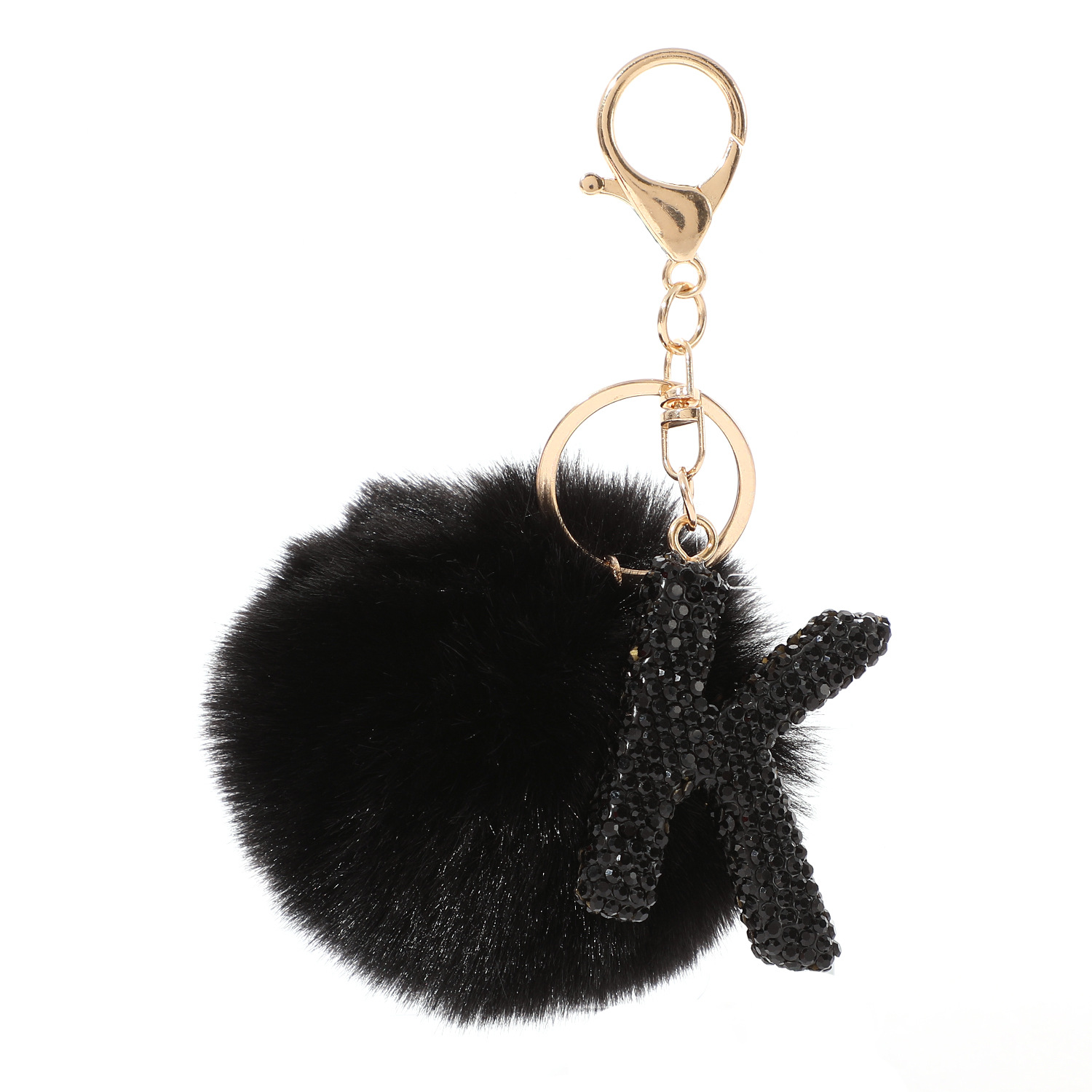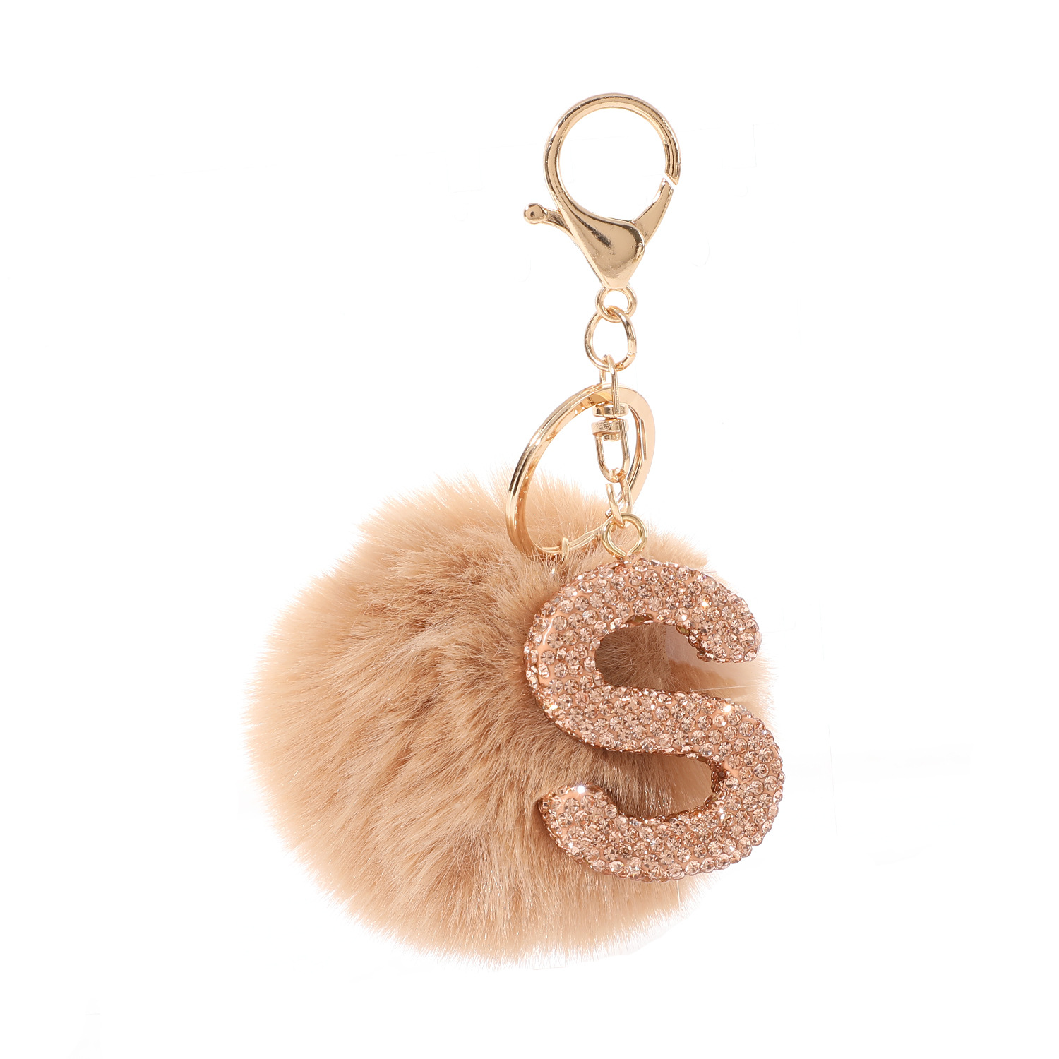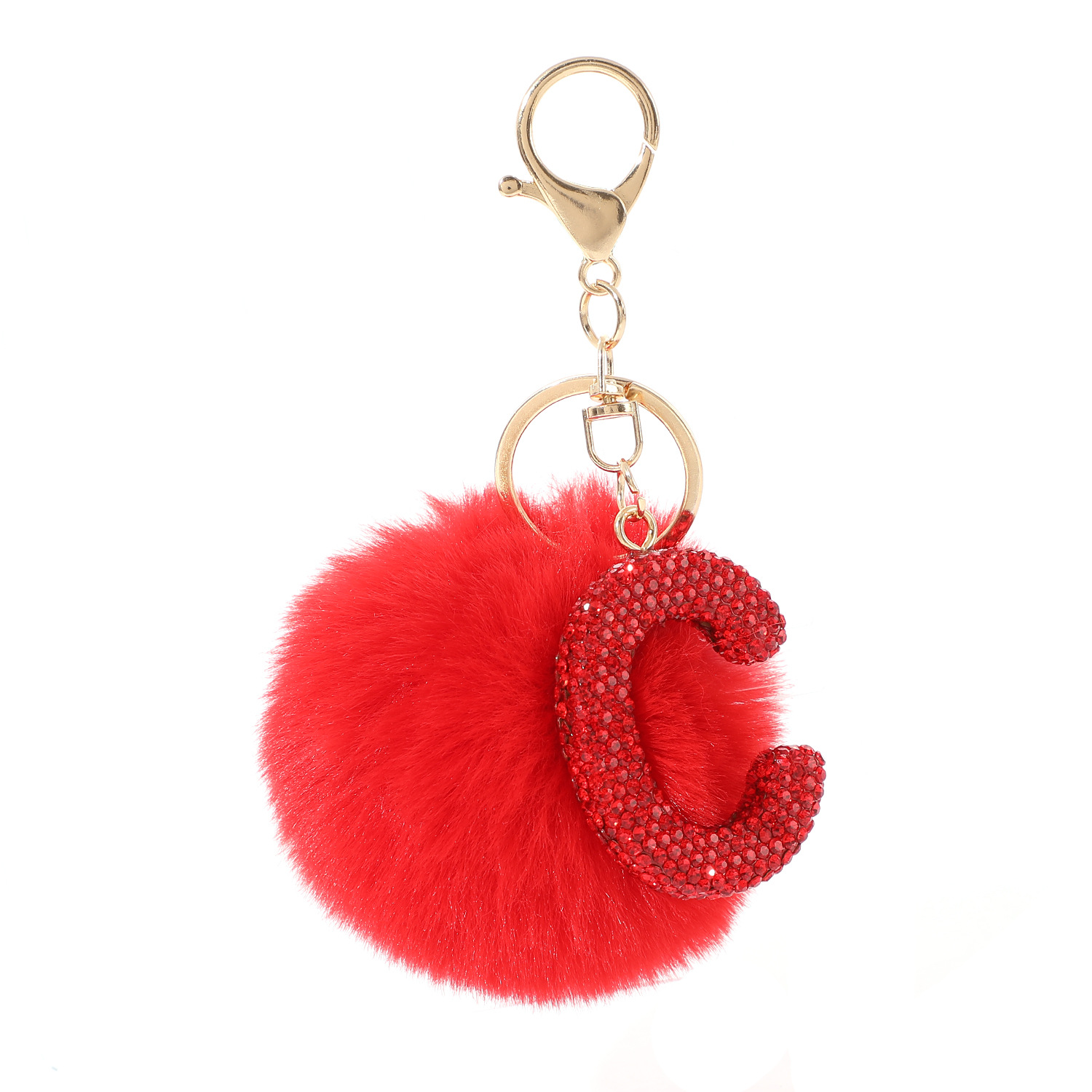新款仿獭兔毛球镶钻合金英文字母钥匙扣包包挂件毛绒箱包配饰批发