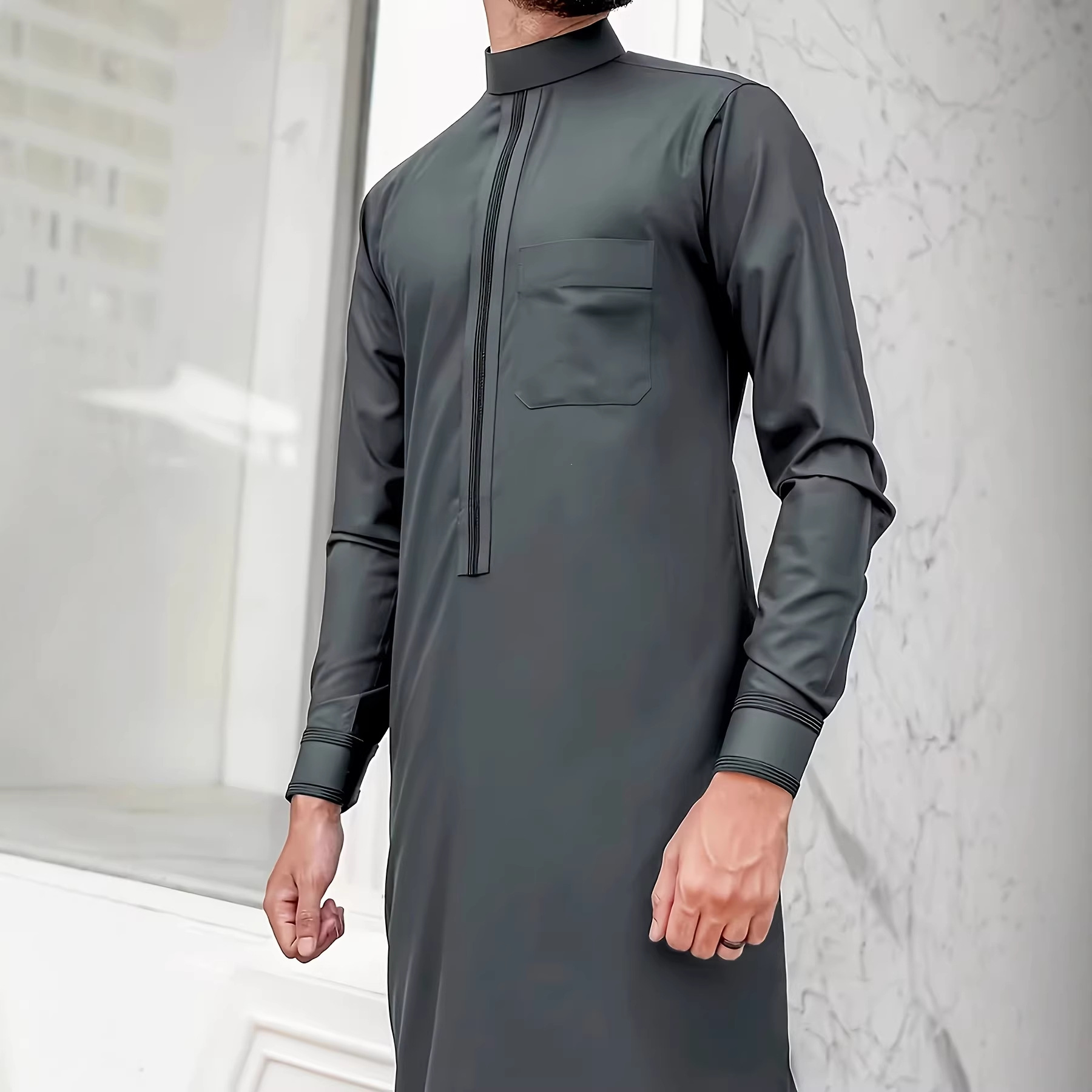 热销跨境时尚纯色男士新款修身休闲非洲男士穆斯林中东民族风长袍
