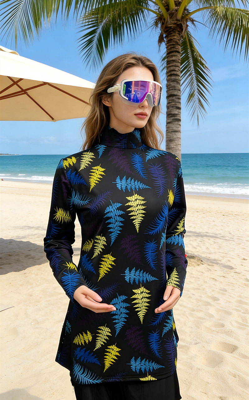跨境外贸女士长袖印花防晒泳衣分体两件套温泉度假保守泳装